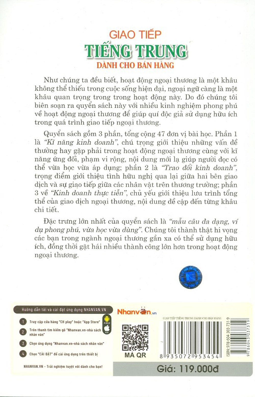 Quyển sách gồm 3 phần, tổng cộng 47 đơn vị bài học. Phần 1 là “Kĩ năng kinh doanh”, chú trọng giới thiệu những vấn đề thường hay gặp phải trong hoạt động ngoại thương cùng với kĩ năng ứng đối, phạm vi rộng, nội dung mới lạ giúp người đọc có thể vừa học vừa áp dụng; phần 2 là “Trao đổi kinh doanh”, trọng điểm giới thiệu tình hữu nghị qua lại giữa hai bên giao dịch và sự giao tiếp giữa các nhân vật trên thương trường; phần 3 về “Kinh doanh thực tiễn”, chủ yếu giới thiệu lưu trình tổng thể của giao dịch ngoại thương, nội dung đề cập đến từng khâu chi tiết. Đặc trưng lớn nhất của quyển sách là “mẫu cầu đa dạng, ví dụ phong phú, vừa học vừa dùng”. Chúng tôi thành thật hi vọng các bạn trong ngành ngoại thương gần xa có thể sử dụng hữu ích, đồng thời gặt hái nhiều thành công lớn hơn trong hoạt động ngoại thương.
