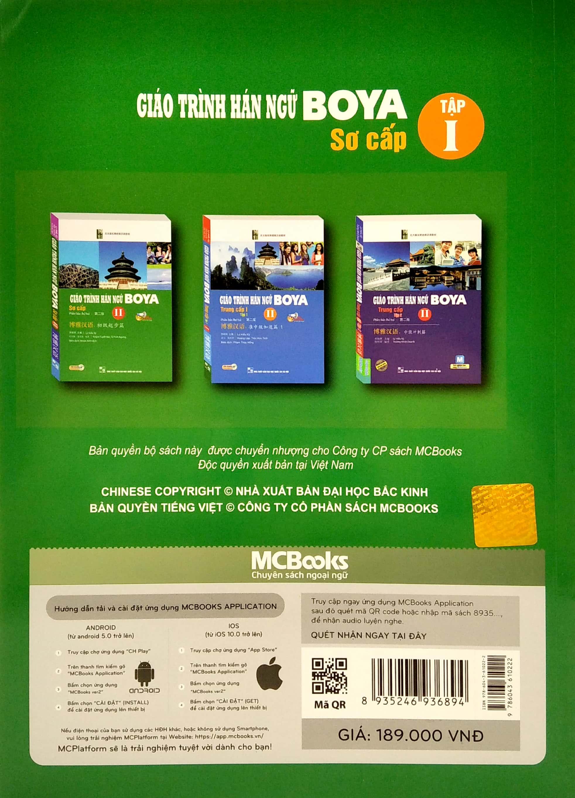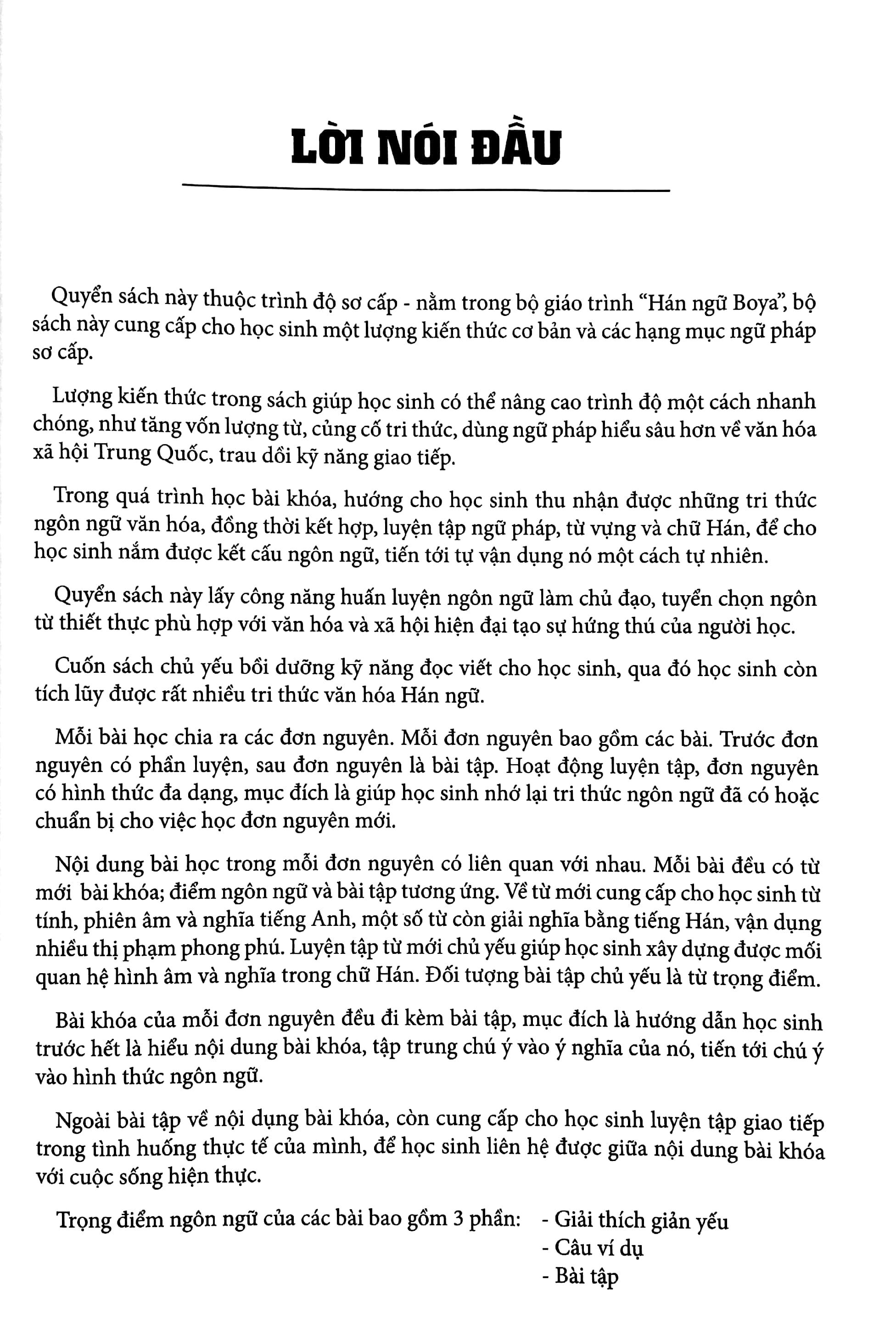 Đây là cuốn sách đầu tiên trong bộ giáo trình Hán ngữ Boya. Bộ giáo trình do được viết các tác giả nổi tiếng người Trung Quốc là Lý Hiểu Kỳ, Từ Lập và Tiền Húc Tinh biên soạn kết hợp cùng MCBooks – chuyên sách ngoại ngữ phát hành độc quyển tại thị trường Việt Nam.