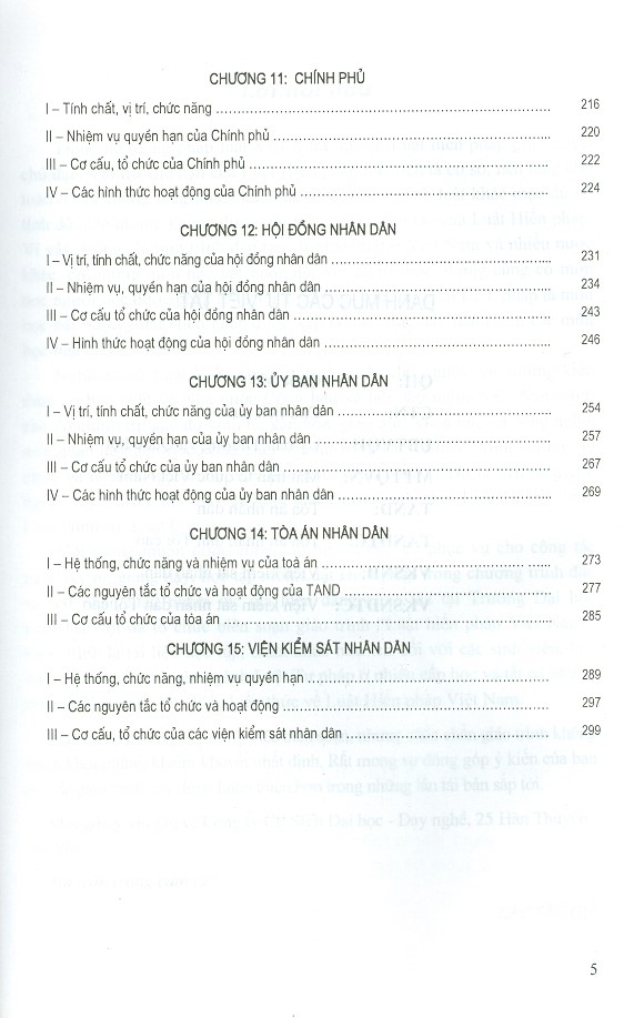 Chương 1: Những vấn đề cơ bản về luật hiến pháp. Chương 2: Hiến pháp và lịch sử lập hiến Việt Nam. Chương 3: Chế độ chính trị. Chương 4: Chế độ kinh tế. Chương 5: Văn hóa, giáo dục, khoa học và công nghệ. Chương 6: Quyền và nghĩa vụ cơ bản của công dân. Chương 7: Chế độ bầu cử. Chương 8: Bộ máy Nhà nước Cộng Hòa Xã Hội Chủ Nghĩa Việt Nam. Chương 9: Quốc hội. Chương 10: Chủ tịch nước. Chương 11: Chính phủ. Chương 12: Hội đồng nhân dân. Chương 13: Ủy ban nhân dân. Chương 14: Tòa án nhân dân. Chương 15: Viện kiểm sát nhân dân.