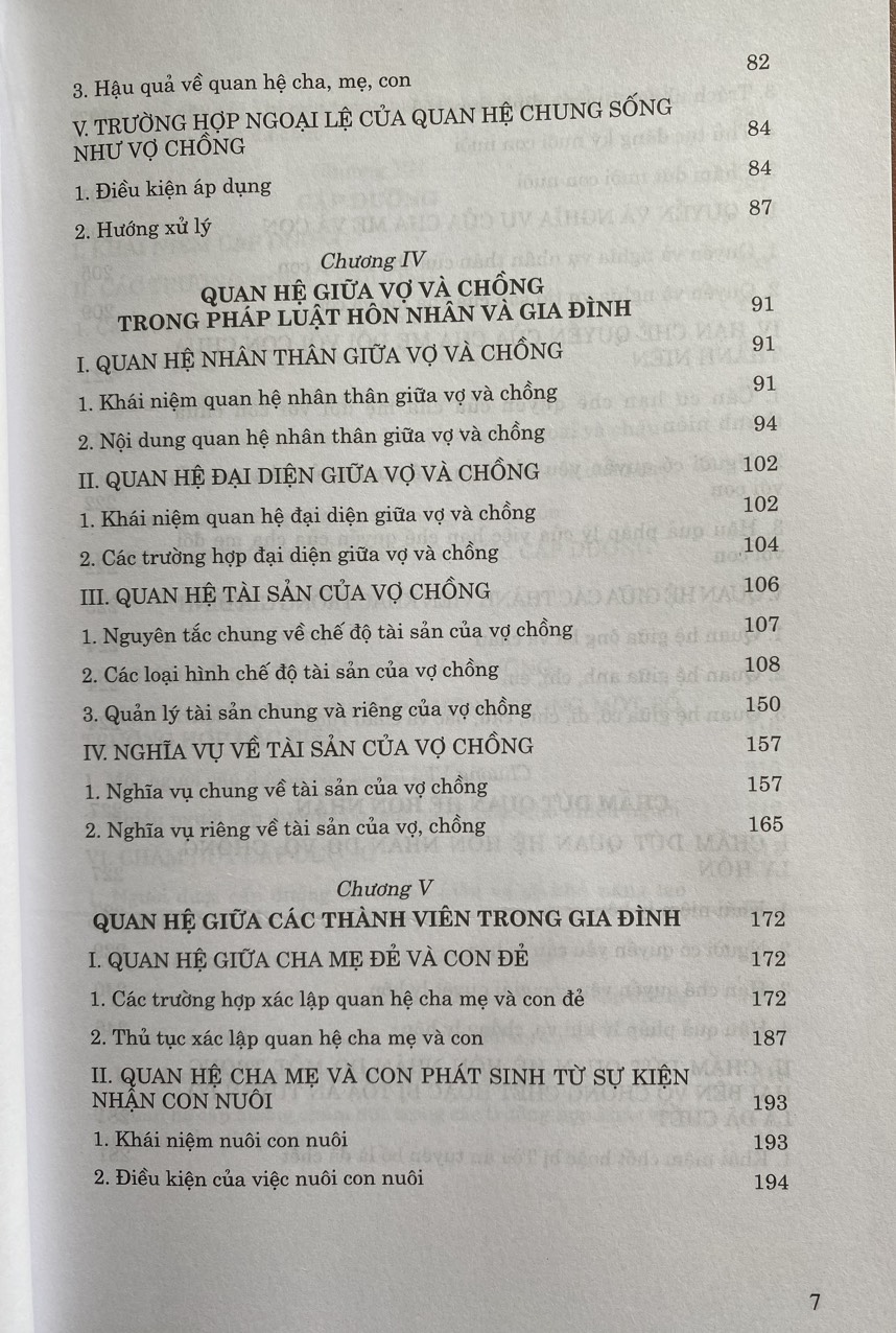 Mục lục: Chương 1: Những quy định chung Chương 2: Kết hôn Chương 3: Quan hệ giữa và chồng Chương 7: Cấp dưỡng Chương 8: Quan hệ hôn nhân và gia đinh có yếu tố