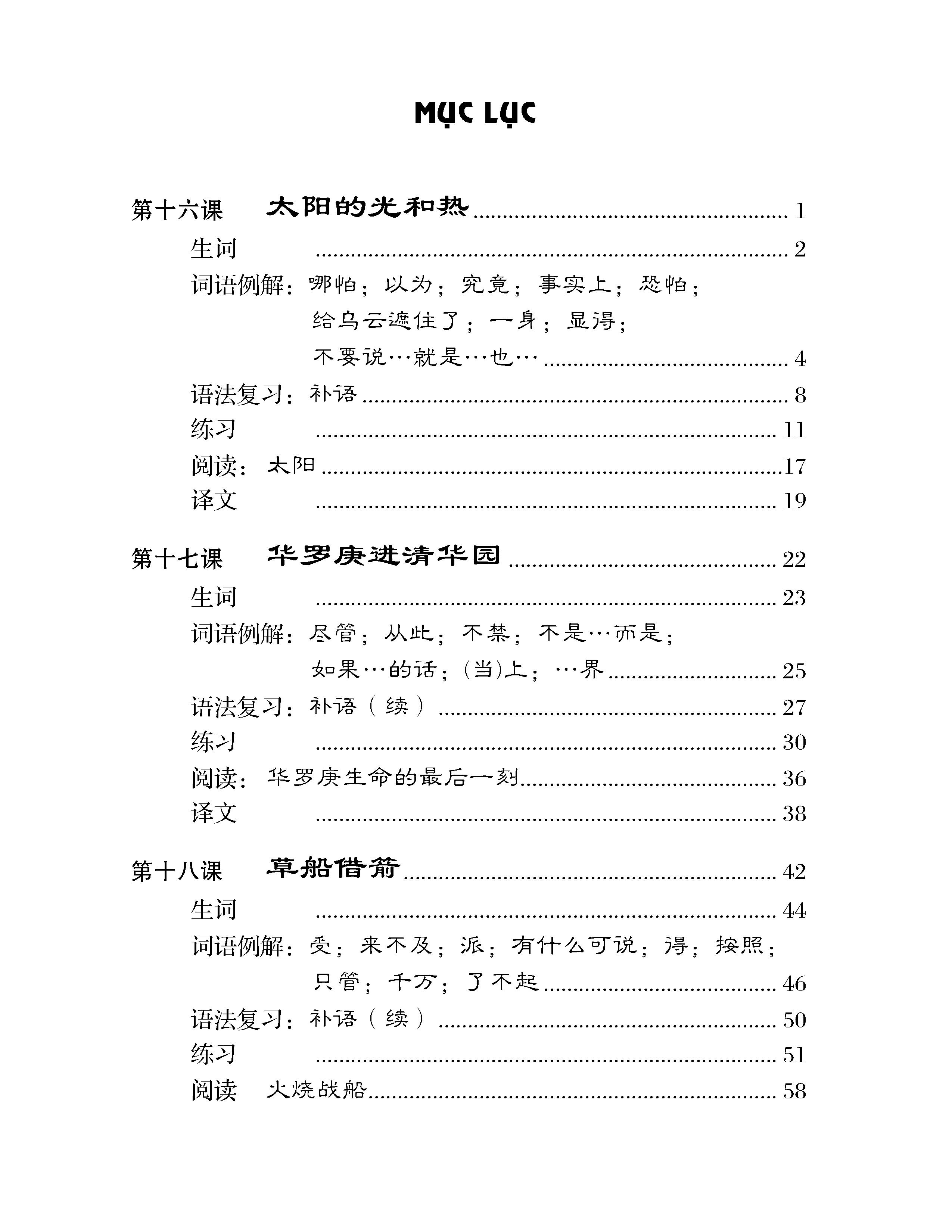 Ngoài ra, để giúp người học củng cố, bổ sung và hệ thống lại các nội dung ngữ pháp đã học trong chương trình sơ trung cấp, khi biên dịch tài liệu này, chúng tôi soạn thêm phần “Ôn tập ngữ pháp” theo hình thức tiểu kết sau mỗi bài. Để người học có thể đối chiếu bài làm, bài dịch của mình, chúng tôi có bổ sung thêm ở cuối sách phần “Đáp án bài tập” và “Bản dịch các bài đọc”. Sách còn có “Bảng từ vựng”, “Bảng danh từ riêng”, “Bảng từ ngữ được giải thích” giúp người học thuận lợi hơn trong việc tra cứu.