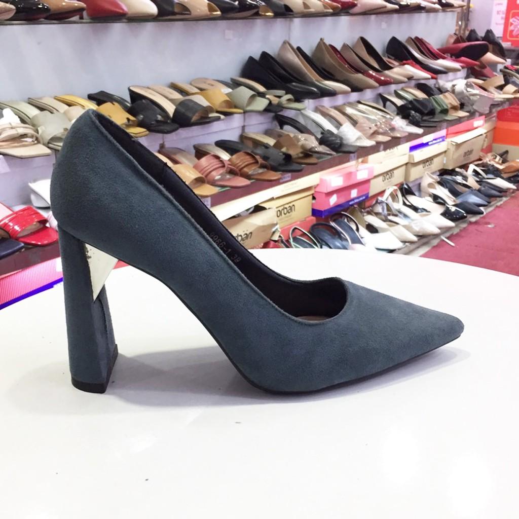 Giày cao gót thiết kế dáng mũi nhọn, chân nhọn phối đế vuông cao 6 cm. Giày có viền đính đá, làm bằng chất liệu da lộn, tone màu đẹp giúp các nàng dễ dàng
