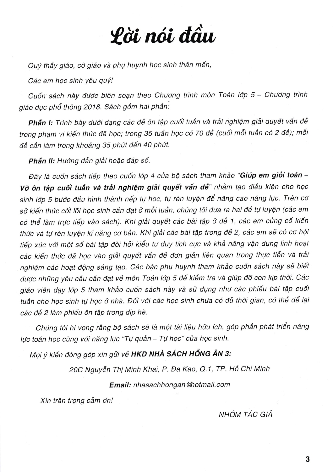 Đây là cuốn sách tiếp theo cuốn lớp 4 của bộ sách tham khảo “Giúp em giỏi toán – Vở ôn tập cuối tuần và trải nghiệm giải quyết vấn đề" nhằm tạo điều kiện cho học sinh lớp 5 bước đầu hình thành nếp tự học, tự rèn luyện để nâng cao năng lực. Trên cơ sở kiến thức cốt lõi học sinh cần đạt ở mỗi tuần, chúng tôi đưa ra hai để tự luyện (các em có thể làm trực tiếp vào sách). Khi giải quyết các bài tập ở để 1, các em củng cố kiến thức và tự rèn luyện kĩ năng cơ bản. Khi giải các bài tập trong để 2, các em sẽ có cơ hội tiếp xúc với một số bài tập đòi hỏi kiểu tư duy tích cực và khả năng vận dụng linh hoạt các kiến thức đã học vào giải quyết vấn đề đơn giản liên quan trong thực tiễn và trải nghiệm các hoạt động sáng tạo. Các bậc phụ huynh tham khảo cuốn sách này sẽ biết được những yêu cầu cần đạt về môn Toán lớp 5 để kiểm tra và giúp đỡ con kịp thời. Các giáo viên dạy lớp 5 tham khảo cuốn sách này và sử dụng như các phiếu bài tập cuối tuần cho học sinh tự học ở nhà. Đối với các học sinh chưa có đủ thời gian, có thể để lại các để 2 làm phiếu ôn tập trong dịp hè.