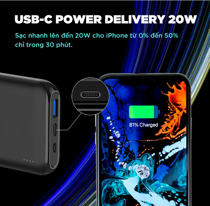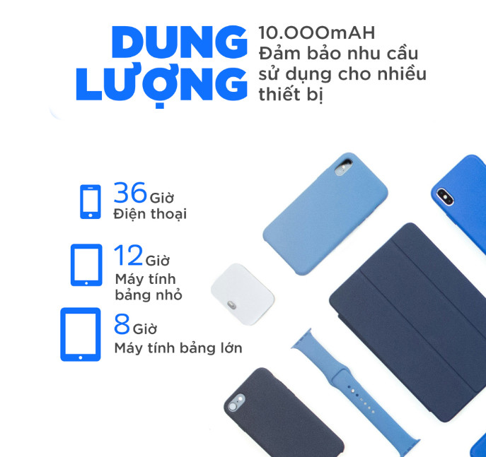 Tính năng Dung lượng 10.000mAh tương ứng 37Wh cung cấp đến nhiều giờ sử dụng cho các thiết bị điện tử 3 cổng sạc ra gồm 1 USB-A và 2 USB-C, thoải mái sạc 3