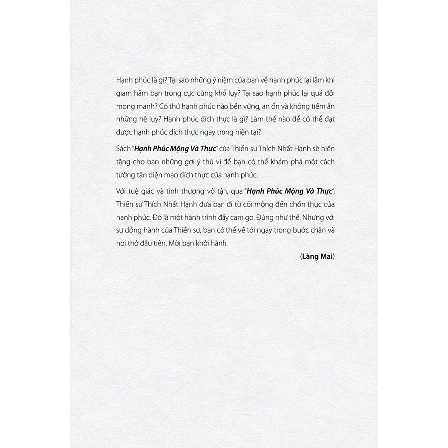 Với Hạnh Phúc Mộng Và Thực, thiền sư Thích Nhất Hạnh sẽ tặng cho bạn những gợi ý thú vị để bạn có thể khám phá một cách tường tận diện mạo địch thực của hạnh phúc.