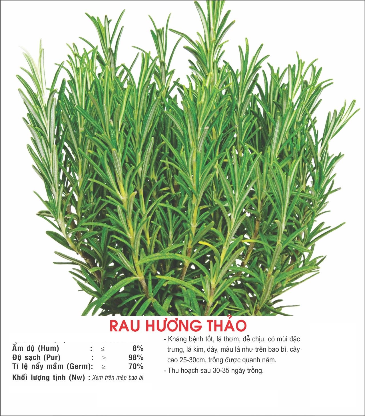 - Đặc tính giống: Cây Hương Thảo, cây dạng bụi, giống kháng bệnh tốt, cây tỏa mùi thơm dễ chịu, có mùi đặc trưng, cây cao 25-30cm, lá kim. Cây hương thảo chứa nhiều tanin và tinh dầu. Mùi thơm hương thảo nồng nhưng không gắt giúp loại bỏ căng thẳng, tăng cường trí nhớ, giúp tinh thần sảng khoái, giảm stress rất nhanh và hạn chế tình trạng buồn ngủ khi làm việc nhiều giờ ở văn phòng. Ngoài ra. Cây Hương Thảo còn sử dụng trong ẩm thực, đặc biệt là các món BBQ.