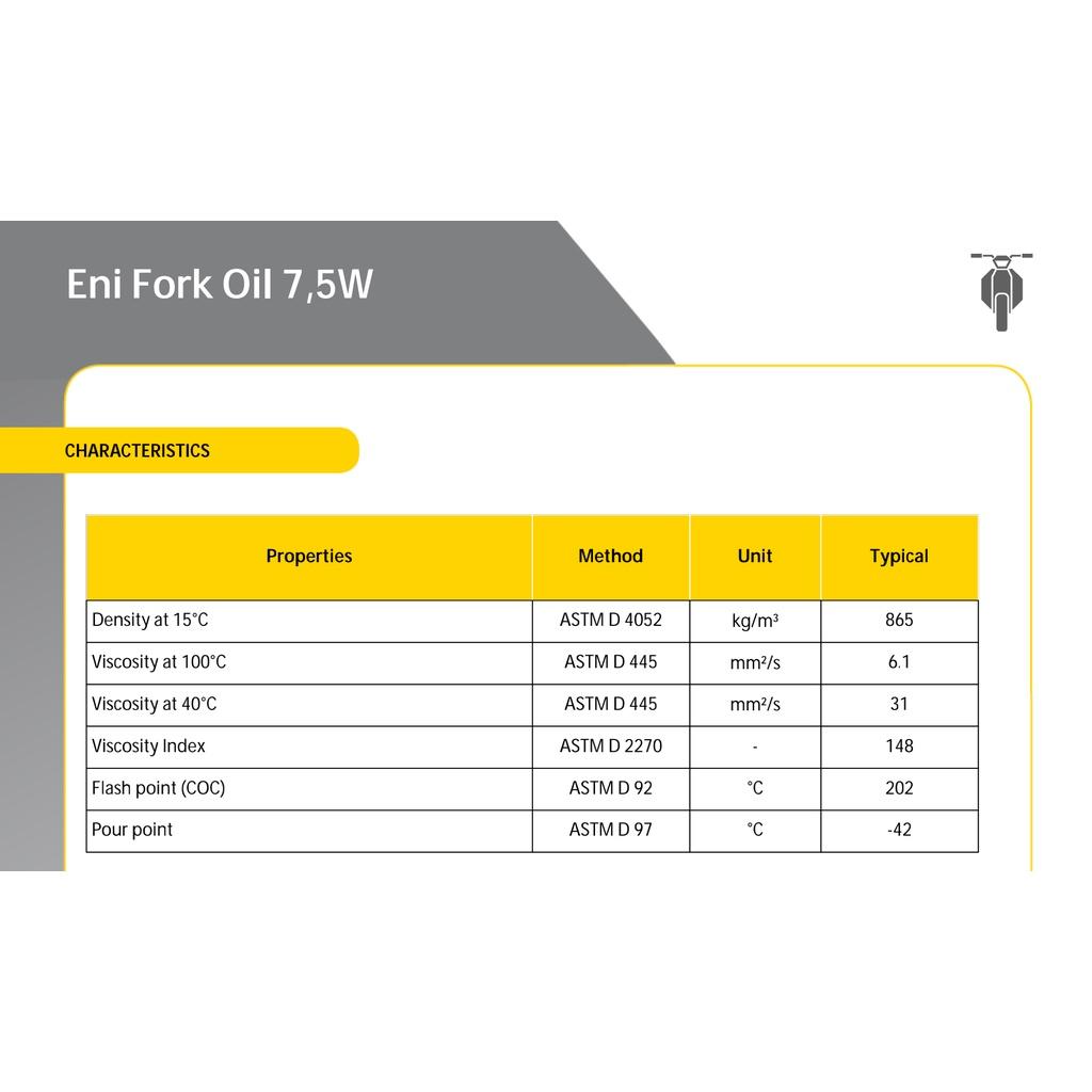 Eni Fork Oil 7.5W là sản phẩm được thiết kế cho ngành công nghiệp xe máy, sử dụng cho phuộc và giảm xóc, phù hợp cho việc sử dụng trên đường trường và địa hình.