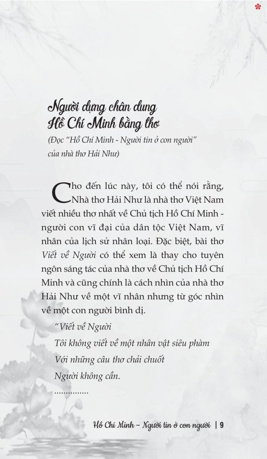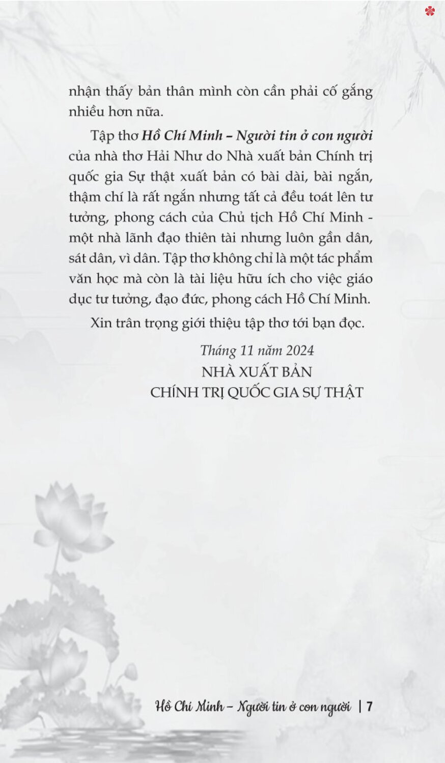 Mua tại TiktokTập thơ Hồ Chí Minh – Người tin ở con người của nhà thơ Hải Như do Nhà xuất bản Chính trị quốc gia Sự thật xuất bản có bài dài, bài ngắn, thậm chí là rất ngắn nhưng tất cả đều toát lên tư tưởng, phong cách của Chủ tịch Hồ Chí Minh - một nhà lãnh đạo thiên tài nhưng luôn gần dân, sát dân, vì dân. Tập thơ không chỉ là một tác phẩm văn học mà còn là tài liệu hữu ích cho việc giáo dục tư tưởng, đạo đức, phong cách Hồ Chí Minh.
