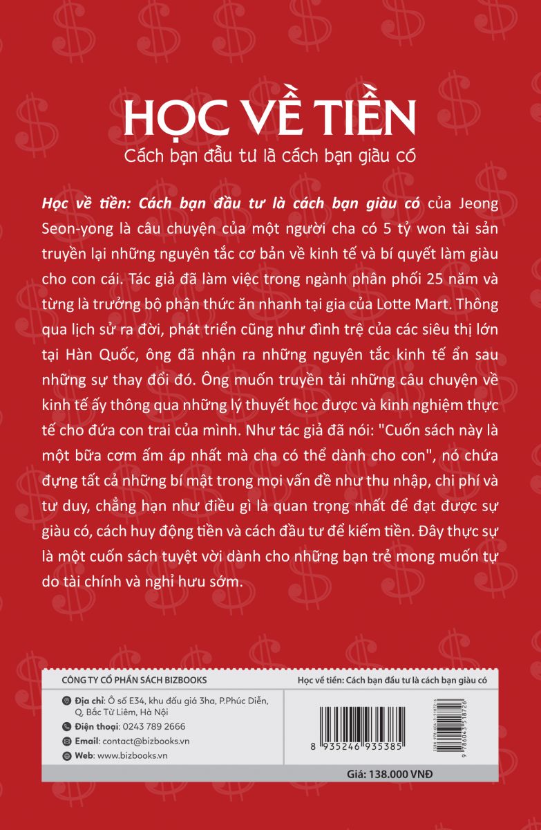 Thấu hiểu những băn khoăn trăn trở của người trẻ trên con đường đi đến tự do tài chính, cuốn sách “Học về tiền” của tác giả Jeong Seon-Yong do công ty cổ phần sách Bizbooks phát hành đã ra đời và gửi gắm đến bạn đọc gần xa. Bằng lối viết đầy nhân văn và sâu lắng dưới giọng tâm tình của người cha dành cho con, cuốn sách như tấm la bàn chỉ đường dành tặng cho cậu con trai của ông về 25 năm kinh nghiệm làm việc và trải nghiệm của chính tác giả, thông qua những bài viết về đầu tư và sự giàu có mà bất kì bạn trẻ nào cũng nên đọc một lần trong đời.