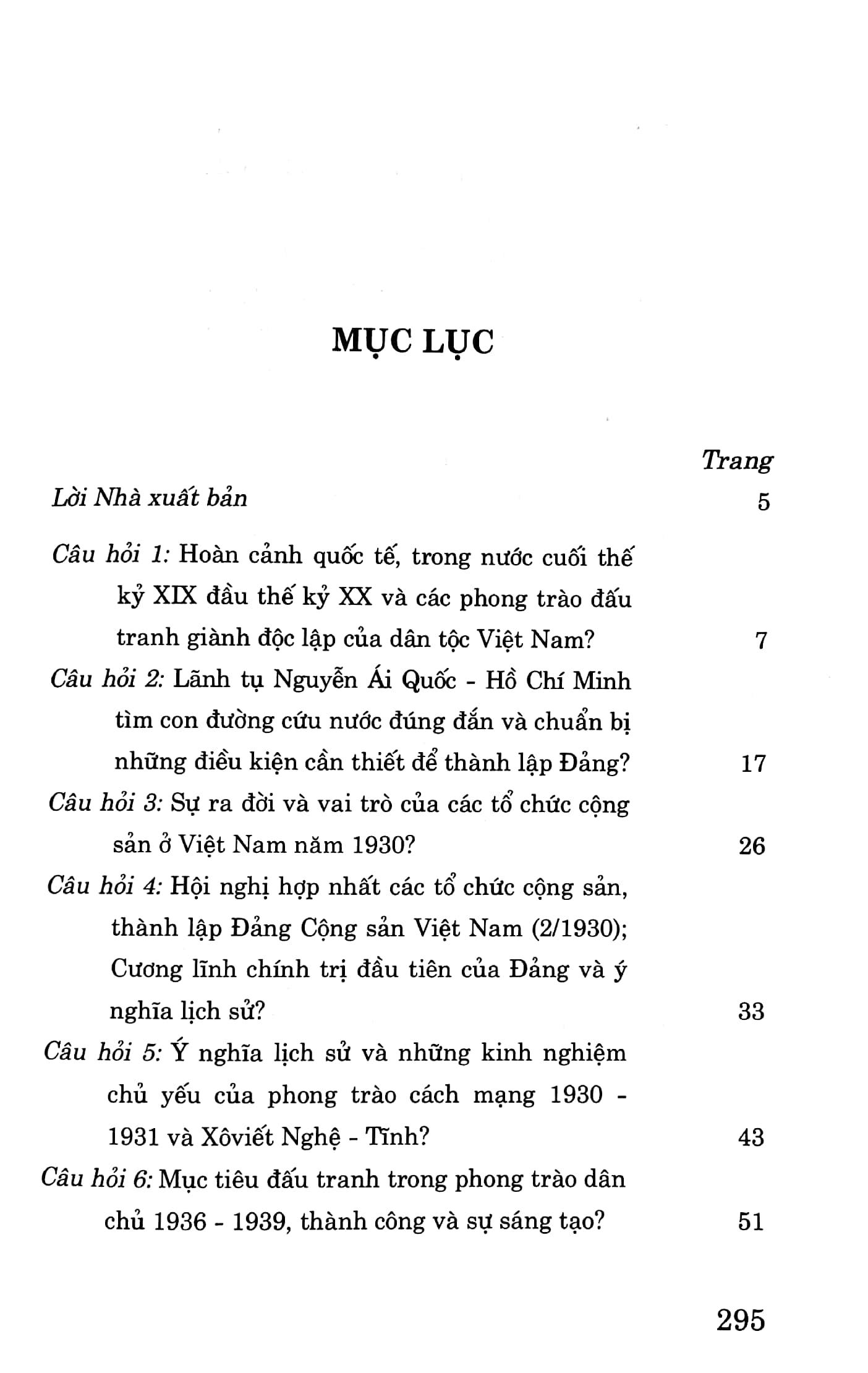 Cuốn sách gồm 30 câu hỏi và trả lời, bám sát nội dung chương trình môn học Lịch sử Đảng Cộng sản Việt Nam, làm rõ từng giai đoạn lịch sử của Đảng Cộng sản Việt Nam từ khi Đảng ra đời, lãnh đạo hai cuộc kháng chiến chống thực dân Pháp và đế quốc Mỹ thắng lợi, đưa đất nước quá độ lên chủ nghĩa xã hội và thực hiện công cuộc đổi mới cùng những bài học lớn về sự lãnh đạo của Đảng. Các câu hỏi và trả lời được tác giả chắt lọc từ kiến thức cơ bản cần nắm vững của môn học; đồng thời mở rộng, làm sâu sắc hơn nội dung cốt lõi của các vấn đề để người dạy và người học hệ thống hóa lại kiến thức của môn học, phục vụ có hiệu quả việc kiểm tra, đánh giá kết quả học tập. Cuốn sách là tài liệu bổ trợ hết sức thiết thực cho giảng viên và sinh viên bậc đại học chuyên và không chuyên lý luận chính trị trong việc “thẩm thấu” giáo trình Lịch sử Đảng Cộng sản Việt Nam.