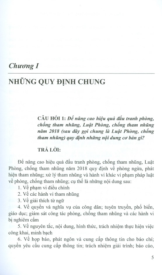 Mua tại TiktokGồm 90 câu hỏi - trả lời liên quan đến những vấn đề về phòng ngừa, phát hiện tham nhũng trong cơ quan, tổ chức, đơn vị; chế độ trách nhiệm của người đứng đầu cơ quan, tổ chức, đơn vị; trách nhiệm của xã hội, của cơ quan nhà nước trong phòng, chống tham nhũng ; hợp tác quốc tế về phòng, chống tham nhũng; xử lý tham nhũng và hành vi vi phạm pháp luật về phòng, chống tham nhũng; điều khoản thi hành.