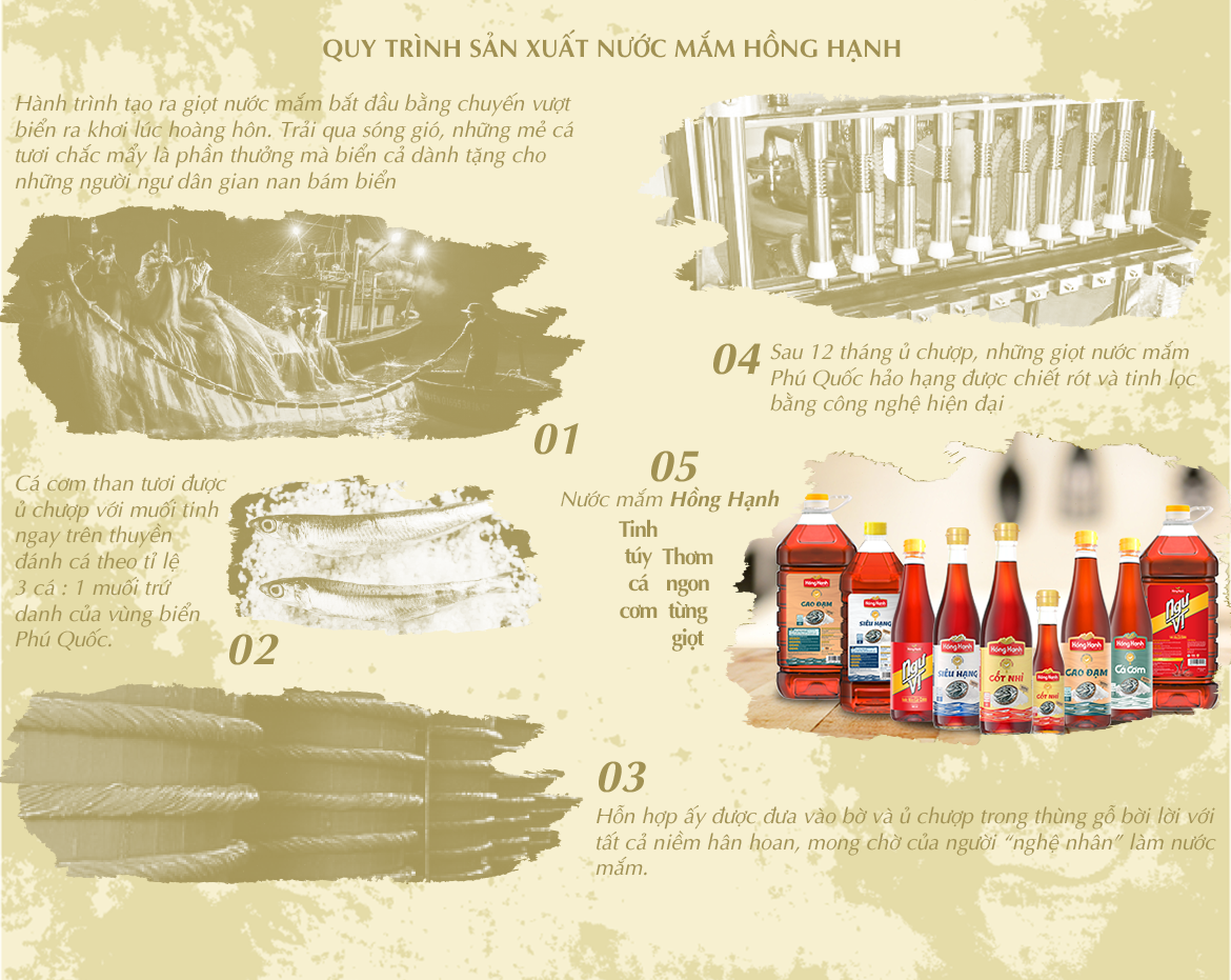- Hành trình tạo ra giọt nước mắm bắt đầu bằng những chuyến vượt biển ra khơi lúc hoàng hôn. Trải qua sóng gió, những mẻ cá tươi chắc mẩy là phần thưởng mà biển cả dành tặng cho những người ngư dân gian nan bám biển. Cá cơm than tươi được ủ chượp ngay trên thuyền đánh cá theo tỉ lệ 3 cá : 1 muối trứ danh của vùng đảo Ngọc. Chính cách ủ chượp khác biệt này đã giữ lại được độ tươi của cá và tạo nên hương vị thơm ngon đặc trưng cho nước mắm Phú Quốc. Hỗn hợp ấy được đưa vào bờ và ủ chượp trong thùng gỗ bời lời với tất cả niềm hân hoan, mong chờ của người “nghệ nhân” làm nước mắm. Sau 12 tháng ủ chượp, những giọt nước mắm Phú Quốc hảo hạng được chiết rót và tinh lọc bằng công nghệ hiện đại LƯU Ý: Vì sản phẩm được làm hoàn toàn 100% từ tự nhiên nên sau thời gian mở nắp sử dụng, màu nước mắm thường sẽ sẫm màu hơn và có hiện tượng lắng cặn. Tuy nhiên đây là hiện tượng bình thường, không ảnh hưởng đến chất lượng sản phẩm, nên quý khách không cần phải lo lắng khi hiện tượng này xảy ra. THẬN TRỌNG: Không dùng cho người bị mẫn cảm với bất kỳ thành phần nào của sản phẩm.