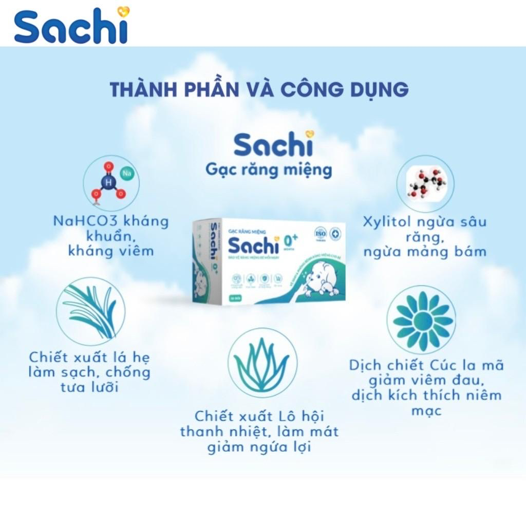 *GẠC RĂNG MIỆNG Gạc răng miệng Sachi có 3 đặc điểm chính: - Công thức ưu việt với chiết xuất Lá Hẹ, NaHCO3, NaCl, Xylitol, bổ sung chiết xuất Cúc La Mã & Lô Hội