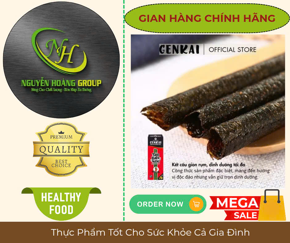 Tên sản phẩm: RONG BIỂN NƯỚNG CUỘN Có 2 Vị : Tự Nhiên & Vị Cay NÓNG Thành phần: Rong biển 68%, dầu ngô 26.7%, dầu mè 4.3%, muối biển 1% Lá Rong biển có