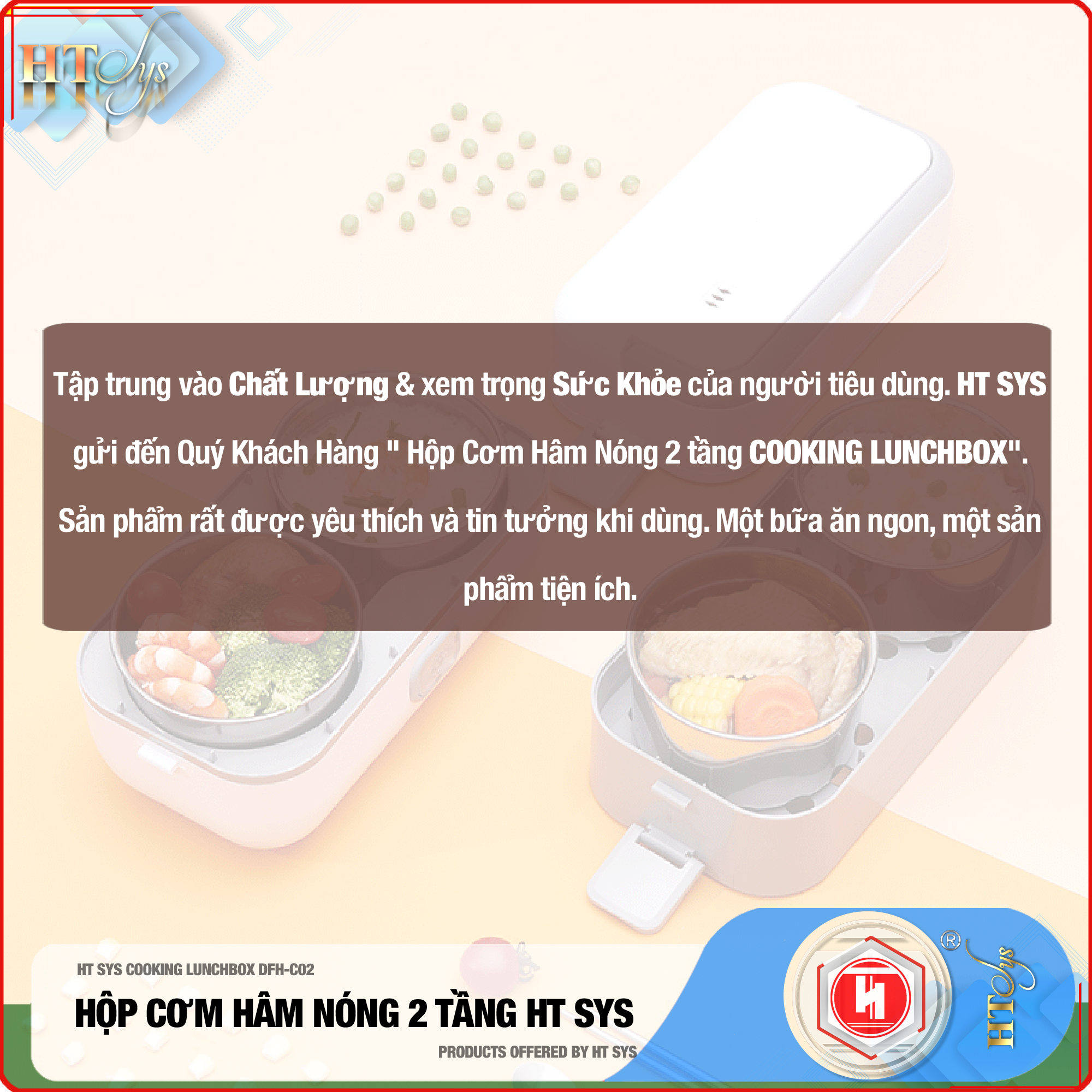- Công dụng: hâm nóng và nấu chín thức ăn. ƯU ĐIỂM HỘP CƠM HT SYS: Bạn có thể hâm nóng thức ăn hoặc chuẩn bị thực phẩm rồi nấu bằng hộp cơm này. Với nguyên lí dùng hơi nước làm chín, hâm nóng đồ ăn nên bạn yên tâm về độ an toàn. Sản phẩm được làm từ nhựa PP an toàn tuyệt đối cho người sử dụng. Bao gồm 2 tầng và 4 hộp cơm inox nên bạn sẽ yên tâm về bữa ăn đầy đủ dinh dưỡng. Bạn sẽ tiết kiệm thời gian, không cần chuẩn bị nhiều thứ rờm rà. Thích hợp với tất cả mọi lứa tuổi, đặc biệt là học sinh, sinh viên và dân văn phòng… CÁC BƯỚC SỬ DỤNG HỘP CƠM CẮM ĐIỆN HT SYS: Bước 1: Cho lượng nước 250ml cần thiết vào thân hộp. Khi cắm điện, đế nhiệt sẽ đun sôi lượng nước này. Bước 2: Cho đồ ăn cần hâm nóng hoặc đồ ăn sống vào các hộp đựng sau đó đóng chặt nắp gài.(Lưu ý khi đun cần bỏ nắp đậy của các bát inox ra ngoài để tránh nhiệt lượng quá cao làm vênh nắp).