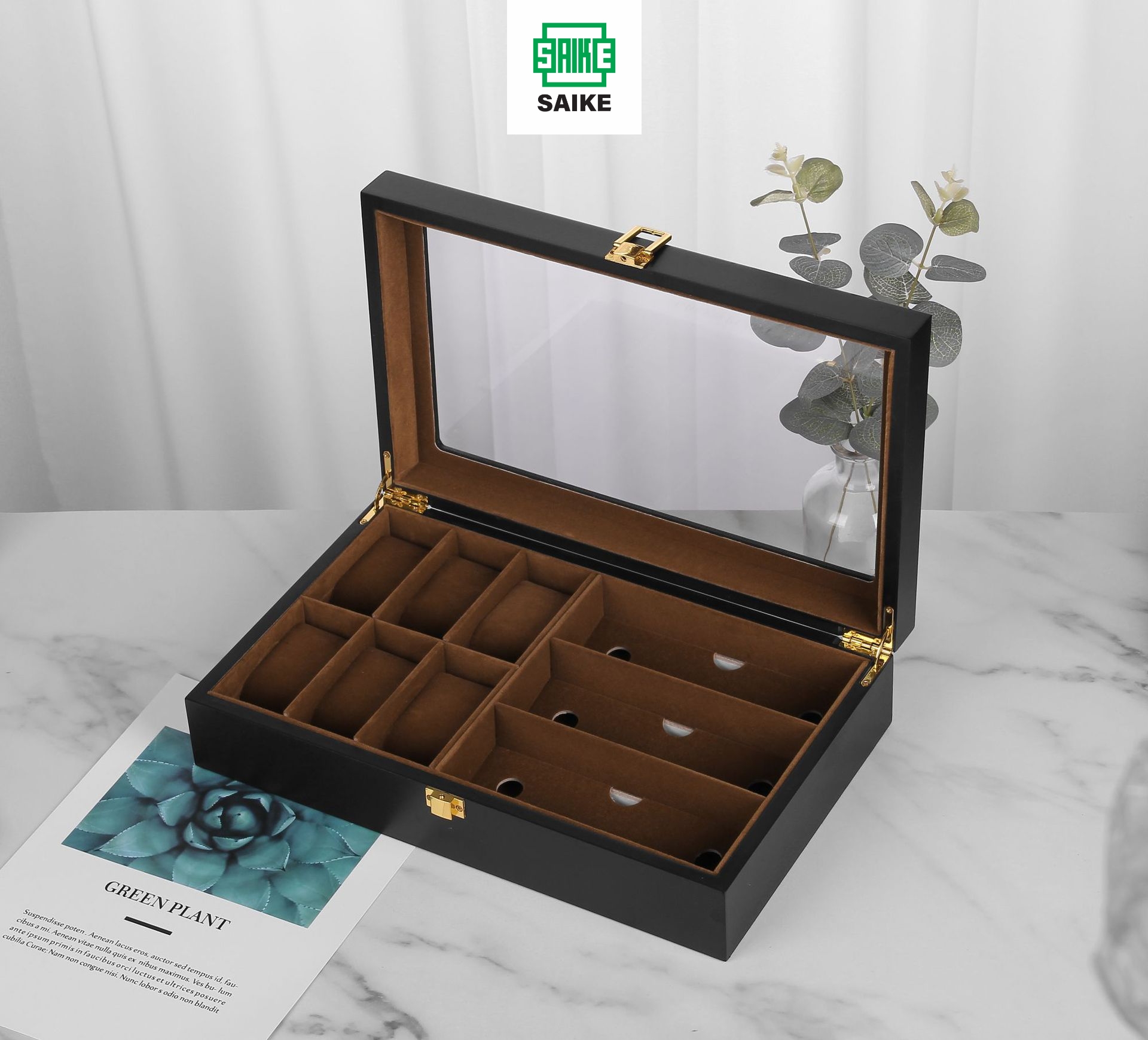Hộp Đồng Hồ Và Mắt Kinh SAIKE S6886 Mẫu Đựng 6 Đồng Hồ Và 3 Mắt Kính Vỏ Gỗ Cao Cấp Lót Nhung Màu Nâu