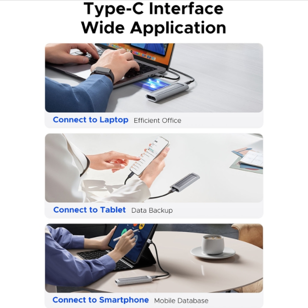 • Sử dụng cáp Type-C to Type-C/A đi kèm, kết nối hộp ổ cứng với thiết bị của bạn, chẳng hạn như laptop, PC, hoặc điện thoại có hỗ trợ kết nối Type-C.