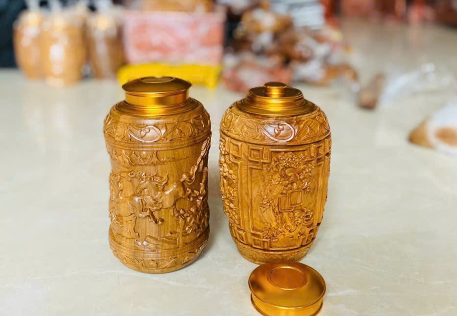 _ Hộp được chạm khắc nhiều hoa văn khác nhau ,khắc tích tứ quý bốn mùa , mã đáo thành công tỉ mỉ ,tinh xảo kỳ công .Đi hầu hết tất cả mọi chi tiết góc ngách nội dung hoa văn của hộp chè đều được gọt tỉa chỉnh sửa sắc nét hoàn toàn bằng tay thủ công .Hộp đựng trà chè được chế tác và hoàn thiện do bàn tay khối óc tài hoa .Từ những người thợ giàu kinh nghiệm cũng như tay nghề cao trong làng nghề truyền thống .