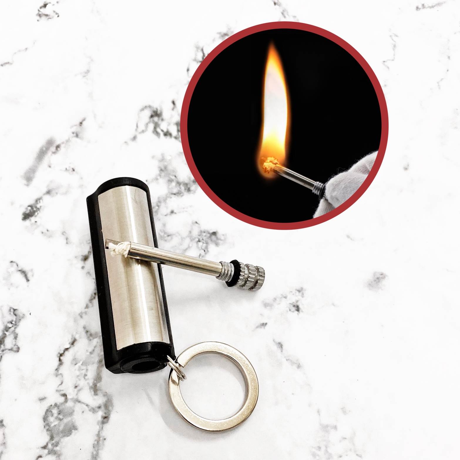 Hột quẹt bật lửa móc khóa diêm xăng sinh tồn hình Trụ Tròn - xài xăng - Nguyên liệu: kim loại nguyên khối – Kích thước: Chiều cao: 5 cm, Chiều rộng: 1.3 cm –