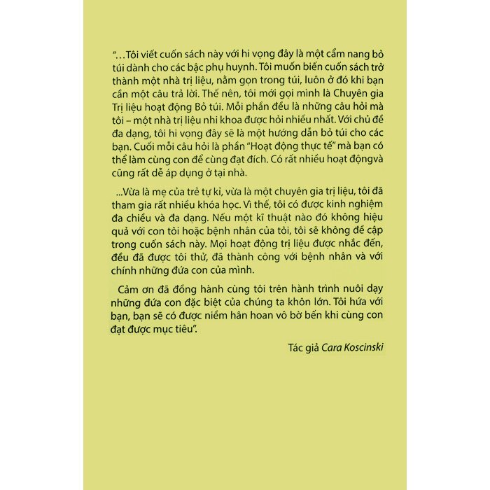“ôi viết cuốn sách này với hi vọng đây là một cẩm nang bỏ túi dành cho các bậc phụ huynh. Tôi muốn biến cuốn sách trở thành một nhà trị liệu, nằm gọn trong túi, luôn ở đó khi bạn cần một câu trả lời. Thế nên, tôi mới gọi mình là Chuyên gia Trị liệu hoạt động Bỏ túi. Mỗi phần đều là những câu hỏi mà tôi – một nhà trị liệu nhi khoa được hỏi nhiều nhất. Với chủ đề đa dạng, tôi hi vọng đây sẽ là một hướng dẫn bỏ túi cho các bạn. Cuối mỗi câu hỏi là phần “Hoạt động thực tế” mà bạn có thể làm cùng con để cùng đạt đích. Có rất nhiều hoạt động và cũng rất dễ áp dụng ở tại nhà.