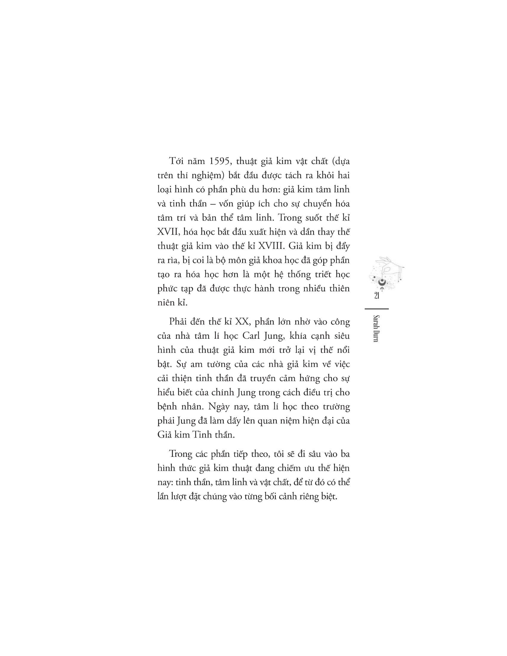 Nhắc tới giả kim, bạn hẳn sẽ tưởng tượng ra hình ảnh một cụ già với chòm râu lớn, ngồi nơi tầng hầm lâu đài, giữa những loại bột bí ẩn và chai lọ sủi bọt suốt ngày đêm để biến chì thành vàng. Nhưng giả kim ẩn chứa nhiều hơn thế. Nó là nghệ thuật của sự chuyển hóa, là chìa khóa để khai mở tiềm thức con người và là công cụ để giúp chúng ta đạt tới được dạng thức cao nhất của bản thể. Giống như nhiều truyền thống khác, thuật giả kim cũng chưa từng thực sự biến mất, thậm chí nó còn phát triển và đan cài trong nguồn gốc của các ngành khoa học hiện đại, từ vật lí lượng tử đến phân tâm học.
