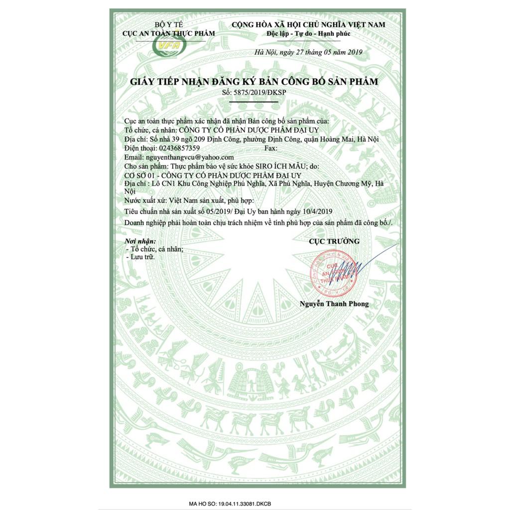 Mua tại TiktokCông dụng: Giúp bổ huyết , điều kinh, hỗ trợ trong các trường hợp rối loạn kinh nguyệt. Đối tượng sử dụng: Dùng cho phụ nữ bị rối loạn kinh nguyệt, phụ nữ sau sinh. Không dùng cho phụ nữ có thai, người mẫn cảm với bất kể thành phần nào của sản phẩm. Cách dùng: Ngày uống 3 lần, mỗi lần 2 viên. Thành phần: Ích mẫu (Leonurus japonicus) Hương phụ (Cyperus rotundus L),1312g Ngải cứu (Artemisia vulgaris),050g Phụ liệu: vỏ nang, canxi Carbonate, bột talcum, magnesi stearate, nipazil, nipasol, tinh bột vừa đủ 1 viên nang cứng. Sản phẩm được sản xuất trong dây chuyền đạt chuẩn GMP Quốc Tế.
