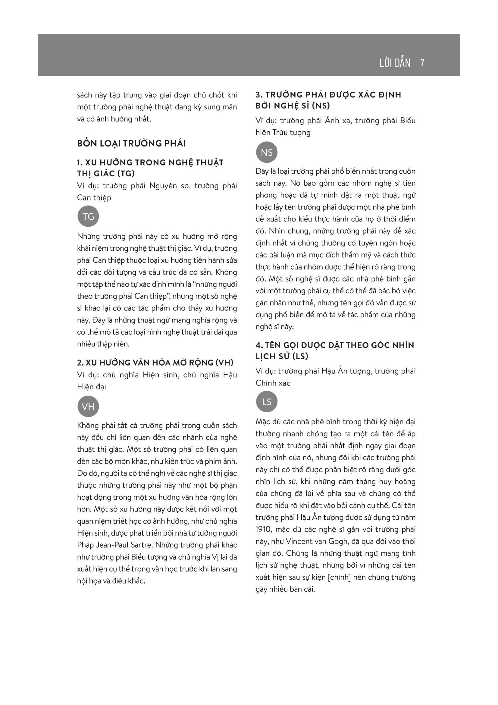 Cuốn sách này là một cẩm nang ngắn gọn giới thiệu cho bạn đọc về 55 trào lưu, trường phái và phong cách thịnh hành từ thời kỳ bình minh hé sáng của nghệ thuật hiện đại cuối thế kỷ 19 cho đến nay, nhằm giúp các bạn làm quen và tiếp cận được một nhánh của dòng chảy lịch sử nghệ thuật.