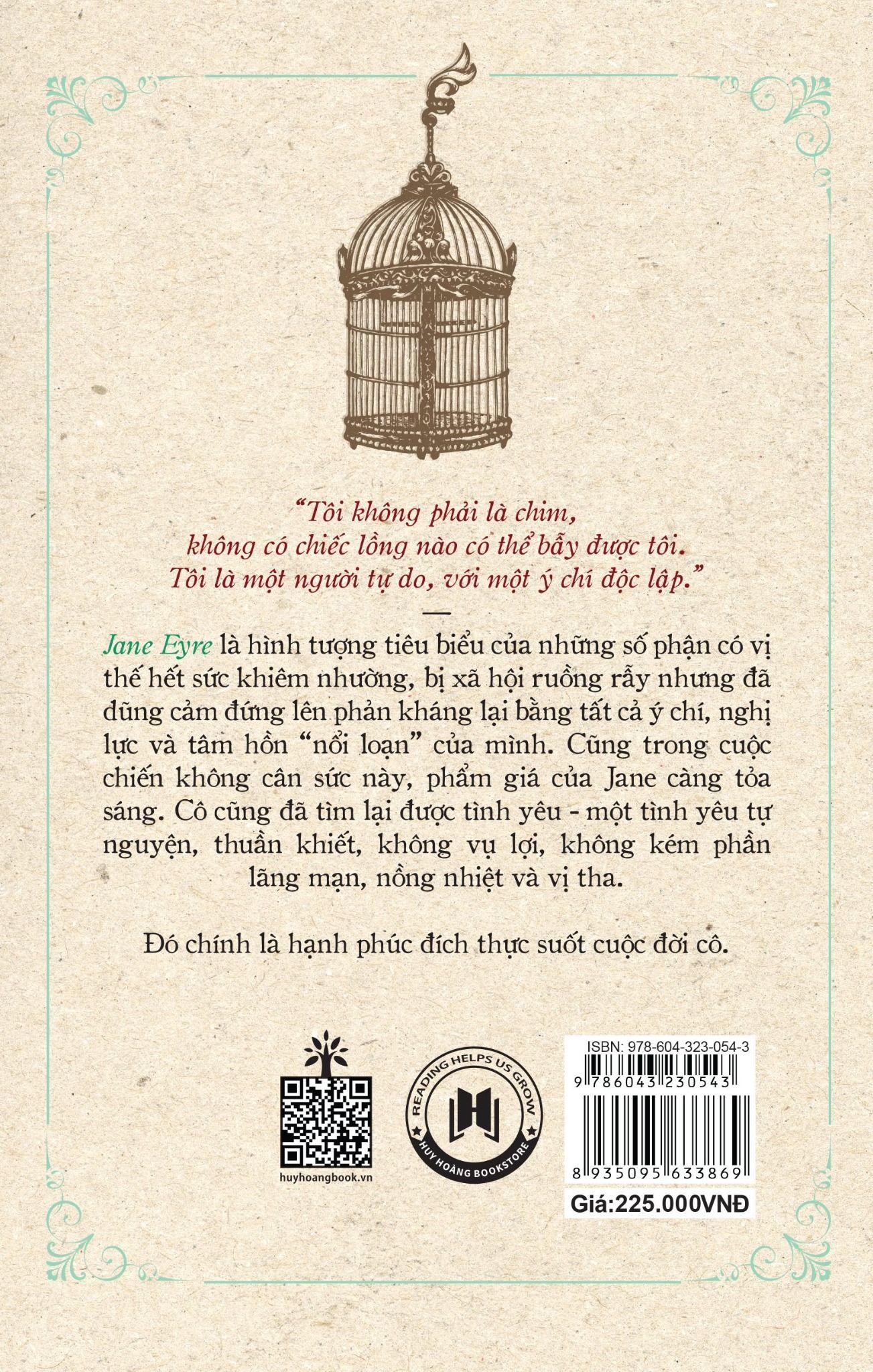 Jane Eyre là hình tượng tiêu biểu của những số phận có vị thế hết sức khiêm nhường, bị xã hội ruồng rẫy nhưng đã dũng cảm đứng lên phản kháng lại bằng tất cả ý chí, nghị lực và tâm hồn “nổi loạn” của mình. Cũng trong cuộc sống không cân sức này, phẩm giá của Jane càng tỏa sáng. Cô cũng đã tìm lại được tình yêu – một tình yêu tự nguyện, thuần khiết, không vụ lợi, không kém phần lãng mạn, nồng nhiệt và vị tha. Đó chính là hạnh phúc đích thực suốt cuộc đời của Jane
