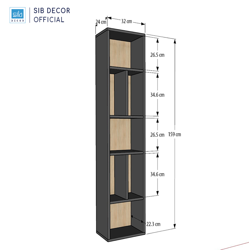 - Kệ gỗ treo tường được thiết kế đơn giản với nhiều ngăn đa năng, chiều rộng 24cm (kích thước lọt lòng sau khi trừ vách sau 22.3cm). Chiều cao các tầng 26.5->34.6cm, đủ để được các cuốn sách lớn khổ A4 trở lên.