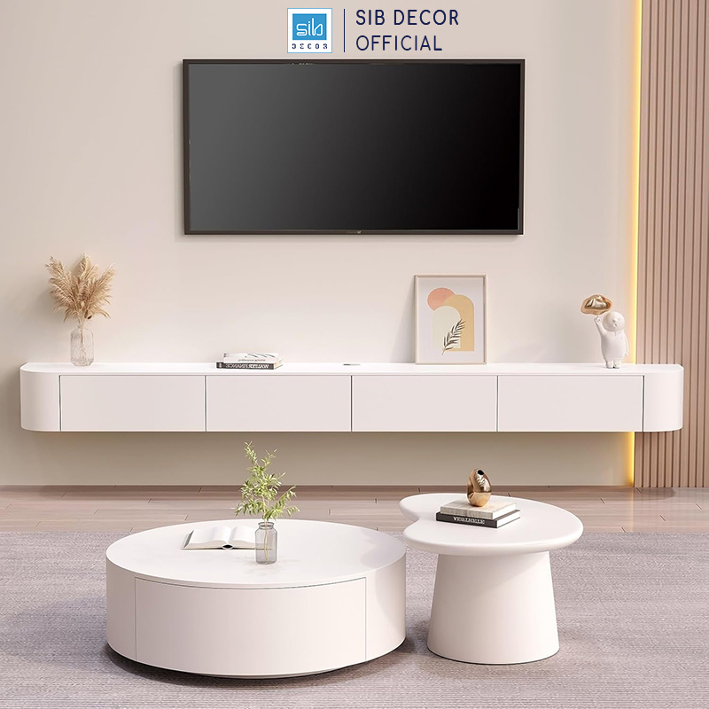 ✨Kệ Tivi Gắn Tường Bo Cong Màu Trắng 2 Ngăn Kéo Và Cánh Mở Hiện Đại SIB Decor TV169