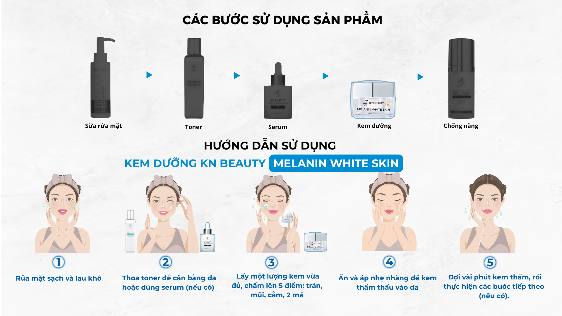 Sử dụng kết hợp với serum KN BEAUTY để đạt hiệu quả tối ưu THÔNG TIN THƯƠNG HIỆU: KN Beauty là thương hiệu mỹ phẩm cao cấp chuyên các dòng dưỡng trắng da mặt, dưỡng trắng toàn thân. Được các nghệ sĩ yêu thích nhất hiện nay và là sản phẩm đạt top 10 thương hiệu Châu Á Thái Bình Dương. HSD: 3 năm kể từ ngày sản xuất NSX: In trên bao bì sản phẩm