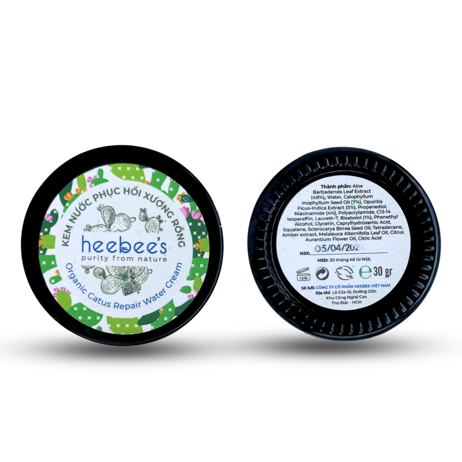 CÔNG DỤNG CỦA KEM DƯỠNG ẨM PHỤC HỒI VÀ TRẺ HOÁ DA CACTUS RECOVERY WATER CREAM MÁT DỊU TỨC THÌ, PHỤC HỒI DIỆU KỲ Với Công nghệ Nano và Trích ly xanh tiên tiến,Kem Dưỡng Ẩm Phục Hồi Và Trẻ Hoá Da được tạo ra với khả năng dưỡng ẩm vượt trội, mang nguồn ẩm len lỏi vào từng lớp tế bào, dưỡng da căng mịn tức thì và duy trì độ mềm mại suốt 24h, đồng thời làm dịu kích ứng nhanh chóng, sửa chữa và phục hồi các tổn thương trên bề mặt da, kể cả các hư tổn lâu năm tạo ra từ quá trình chăm sóc da trước đó, khôi phục hàng rào bảo vệ da chống lại các tác nhân gây lão hóa, đánh thức năng lượng tươi trẻ của làn da, dưỡng da sáng khỏe và săn chắc hơn.   Điểm đột phá của Kem Nước đến từ việc phát triển thành công Chiết xuất Xương Rồng với kỹ thuật siêu âm đến từ đội ngũ nghiên cứu Heebee. Xương rồng vốn là loài cây sở hữu nhiều hoạt chất chống oxy hóa và phục hồi, nhờ vào kỹ thuật trích ly công nghệ cao đã giúp thu hoạch trọn vẹn các hoạt chất thành phần chất lượng như piscidic acid, Những hoạt chất này có khả năng vượt trội trong việc thúc đẩy sự sản sinh collagen tự nhiên và cân bằng độ ẩm làn da, đồng thời tạo sự cân bằng hệ vi sinh duy trì độ ẩm thiết yếu cho làn da, đẩy nhanh quá trình làm lành các tổn thương, tăng khả năng tự bảo vệ của da trước các tác động xấu từ môi trường, sinh lý và tuổi tác, làm chậm quá trình oxy hóa da và ngăn ngừa dấu hiệu lão hóa và dưỡng da mịn màng, đều màu, trẻ trung. Kem Dưỡng Ẩm Phục Hồi Và Trẻ Hoá Da sở hữu nét độc đáo với hệ dưỡng chống lão hóa thực vật từ 2 thành phần thuần Việt đạt chứng nhận hữu cơ EcoCert Cosmo Châu Âu: chiết xuất Xương Rồng và dầu Mù U cùng các loại dầu nuôi dưỡng và các hoạt chất khoa học mang đến khả năng cấp ẩm, dưỡng da trắng đều màu và chống oxy hóa mạnh mẽ: