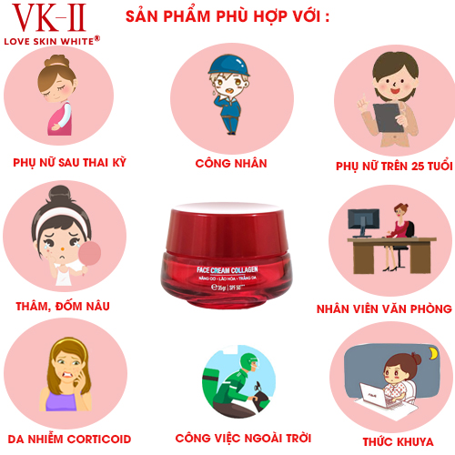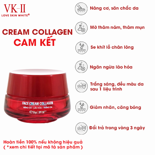 Thành phần : Vaseline, Paraffinum Liquidum, Isopropyl Myristate, Beewax, Talc, Titanium Dioxide (7,0% ), Niacinamide, Tocopheryl Acetate, Hydrolyzed Collagen, Boric Acid (0,8%), Salicylic Acid (0,5%), Parfum, DMDM Hydantoin (0,1%), CI 15985.  Công dụng:   - Giúp dưỡng trắng da và đều màu da  - Tái tạo collagen giúp nâng cơ, chống lại các dấu hiệu gây lão hóa da, làm giảm sự hình thành của các nếp nhăn  - Nuôi dưỡng và làm săn chắc da  - Bổ sung độ ẩm giúp da mịn  màng, se khít lỗ chân lông  - Ngăn ngừa mụn, nám, tàn nhang hiệu quả. *Cách sử dụng :   - Sử dùng ngày 2 lần sáng và tối sau khi rửa sạch mặt  - Dùng lượng kem vừa đủ và chia đều 5 điểm: trán, mũi, cằm và 2 má. Sau đó thoa đều nhẹ nhàng hướng từ dưới lên, massage đều và vỗ nhẹ để kem thẩm thấu hoàn toàn vào da.