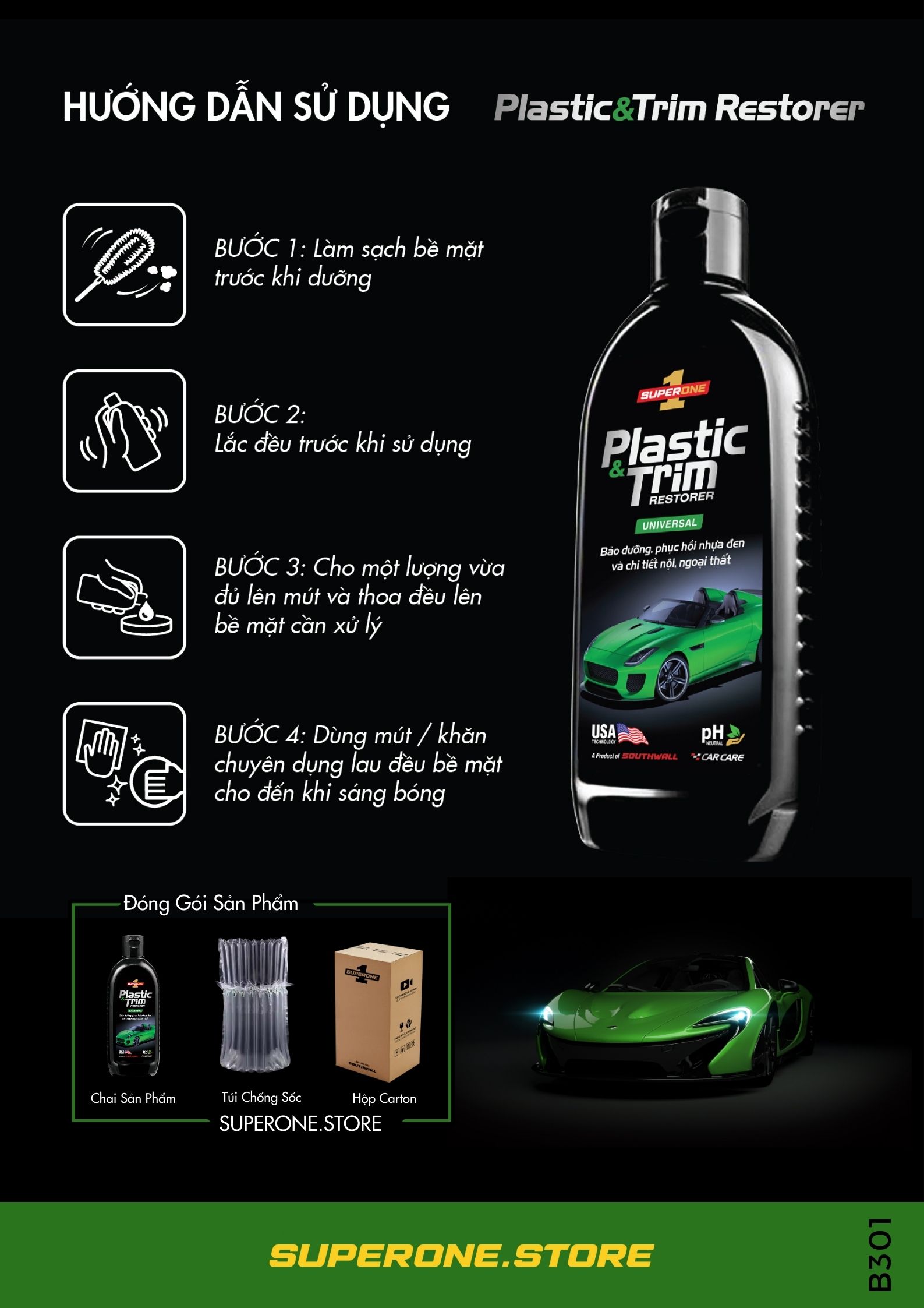 BẢO DƯỠNG, PHỤC HỒI NHỰA ĐEN NỘI, NGOẠI THẤT   Kem Phục Hồi Bảo Dưỡng Nhựa & Ốp Viền Ô Tô Super One Plastic & Trim Restorer - Universal, sản phẩm đa năng dành riêng cho nhựa, cao su và da tổng hợp trên xe ô tô của bạn. Sản phẩm này được công thức hóa để làm sạch, bảo vệ và phục hồi màu sắc tươi sáng của tất cả các thành phần nhựa, cao su và vinyl trên xe của bạn. Bảo quản các chi tiết bên trong như bảng điều khiển, taplo, cửa xe và ron viền, đồng thời làm mới các bề mặt nhựa không sơn. Công thức khô nhanh, không nhờn, kháng nước tốt và ngăn ngừa hiện tượng nhựa mất màu do tác động của tia UV. Sản phẩm còn giúp làm mờ nhẹ các vết trầy và loại bỏ các vết xỉn màu.   Đặc Tính Sản Phẩm