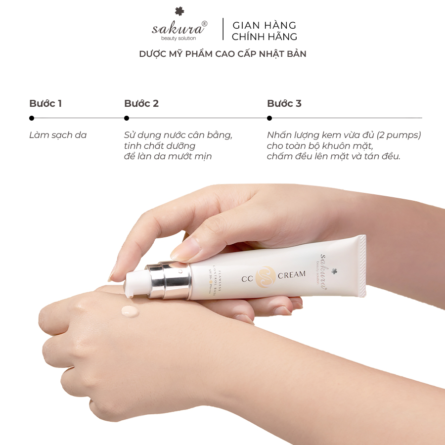 - Bước 3: Cho 1 lượng nhỏ Kem trang điểm chống nắng đa năng Sakura CC Cream Flawless Control Base SPF50+ PA++++ ra lòng bàn tay, sau đó dùng ngón tay xoa nhẹ kem. Kế tiếp, tiến hành chấm nhẹ kem lên vùng chữ T như: Trán, mũi, 2 bên má và cằm rồi dùng tay tán đều ra cả 5 điểm vừa chấm. ►LƯU Ý Để tránh tình trạng màu da trắng đen không đồng đều ở mặt và cổ, gây mất thẩm mỹ, bạn hãy tán thêm một chút Kem trang điểmchống nắng đa năng Sakura CC Cream Flawless Control Base SPF50+ PA++++ lên vùng cằm dưới và cổ. Đối da khô, trước khi dùng Sakura CC Cream, bạn nên thoa một lớp kem dưỡng ẩm khi da còn đang ướt để cân bằng độ ẩm cho da, tránh tình trạng da bị bong tróc, thiếu nước đồng thời giúp lớp nền mịn đẹp hơn. Không thoa kem quá dày để tránh cho lỗ chân lông bị bít tắc, dễ sinh ra mụn và kích ứng. Tẩy trang thật kỹ sau khi trang điểm với nước tẩy trang chuyên dụng và rửa sạch lại bằng sữa rửa mặt. ►HƯỚNG DẪN BẢO QUẢN