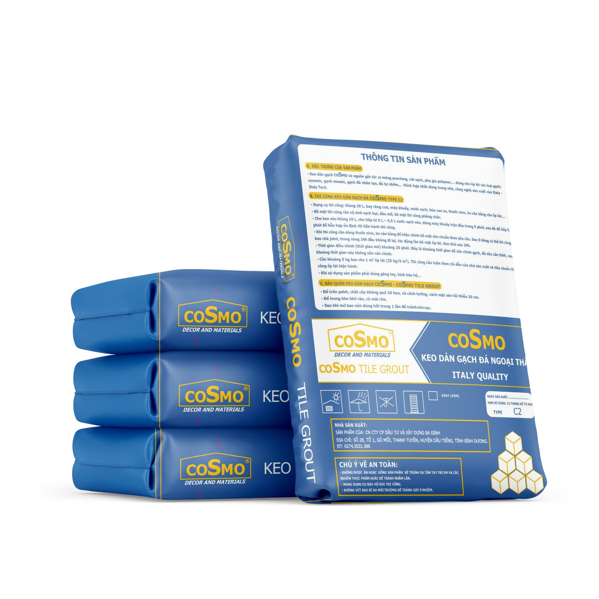 Keo dán gạch ngoại thất cosmo Keo dán gạch thương hiệu COSMO có thành phần chính là xi măng pooclăng, cát sấy đã đượcphân cấp hạt cùng một số phụ gia polyme đặc biệt tạo