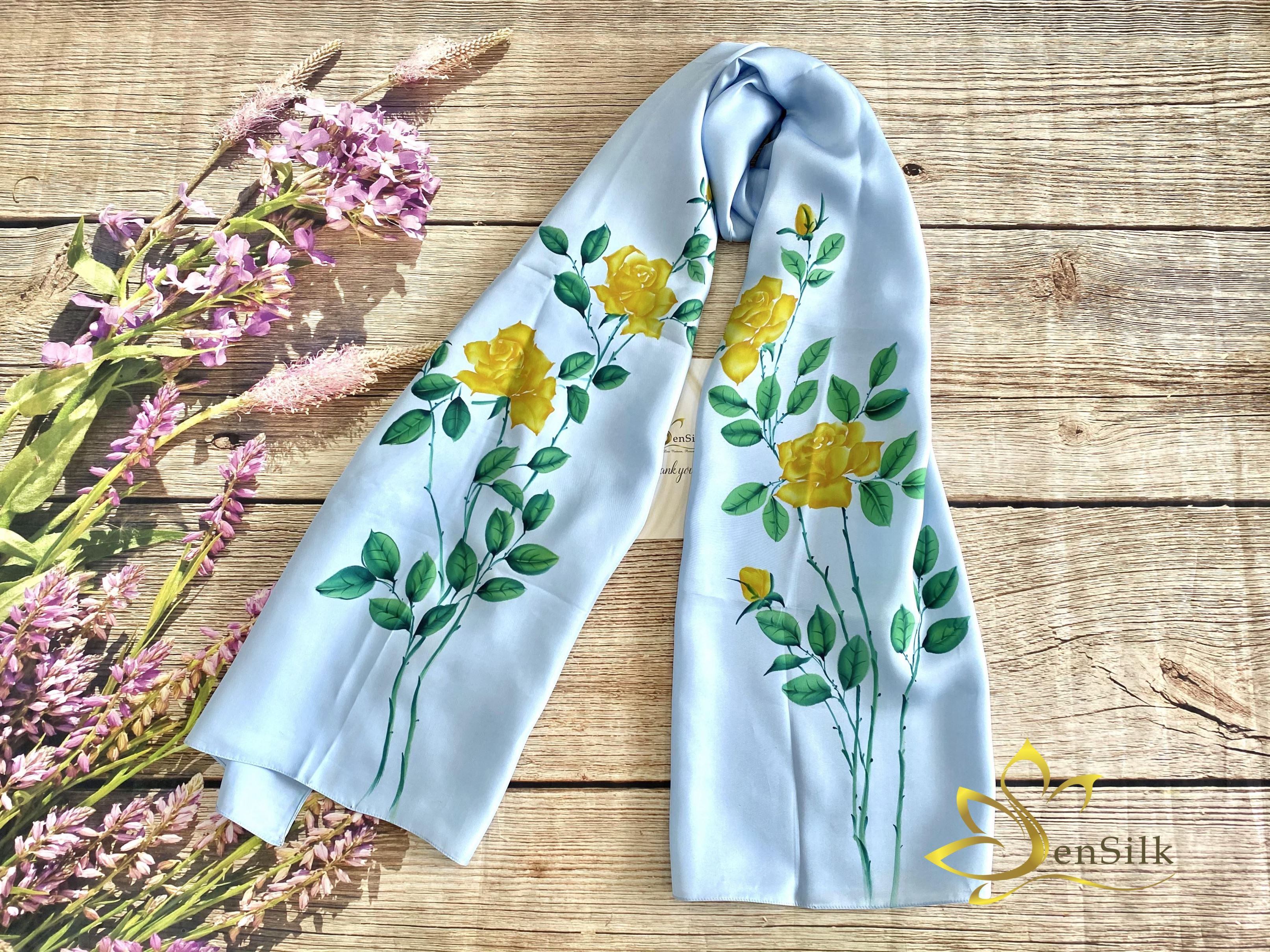✨Khăn Lụa Bảo Lộc Vẽ Tay Rose SenSilk180x55cm, Hand Drawing Silk Scarf, 100% Silk made in Vietnam
