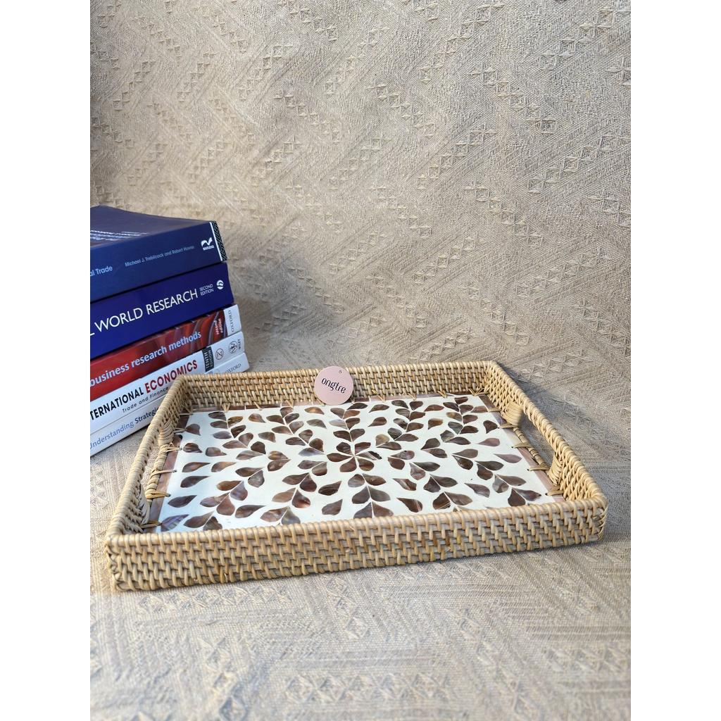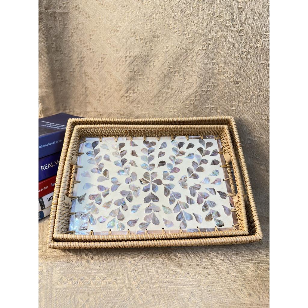 Khay mây khảm trai chữ nhật ONGTRE có tay cầm đựng hoa quả, decor dùng cho nhà hàng khách sạn resort - Sản phẩm được làm thủ công từ những bàn tay của các nghệ