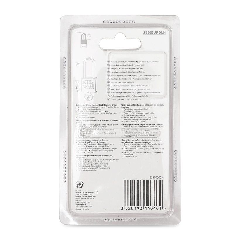 KHÓA MASTER LOCK INOX CHỐNG ĂN MÒN 2350DLH - Cơ chế chốt càng khóa bằng hệ thống bi kép inox chống búa đập, nạy càng khóa. - Càng khóa dài phù hợp với