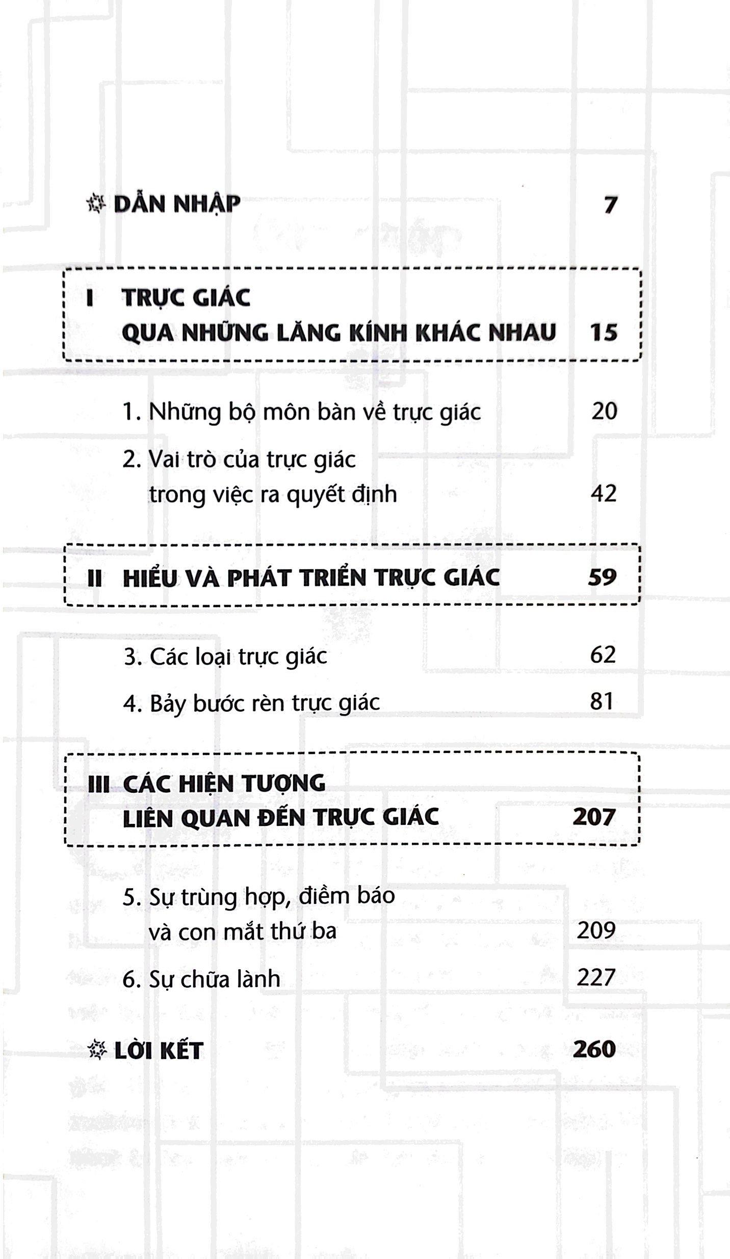- Bác sĩ Cate Howell, Khơi Nguồn Năng Lực Trực Giác Trực giác là điều hầu hết mọi người sẽ trải nghiệm trong đời, vào lúc này hoặc lúc khác. Đó là linh cảm, là tiếng nói nội tâm hay “giác quan thứ sáu”. Nhưng liệu ta có thể chủ động phát triển trực giác và học cách ứng dụng nó tốt hơn cho cuộc sống? Bác sĩ Cate Howell tin là ai cũng có thể! Trong cuốn sách lý thú này, bác sĩ Howell khám phá trực giác là một phần của triết học, tâm lý học, tôn giáo và tâm linh từ cổ xưa cho đến hiện đại như thế nào. Bà cũng tìm hiểu về khoa học đằng sau trực giác, và cách mô tả kinh nghiệm trực giác theo chức năng não bộ. Cuối cùng, bà vạch ra chương trình bảy bước nhằm phát triển và sử dụng trực giác giúp cải thiện cuộc sống hàng ngày, để mỗi người cảm nhận được sự bình yên, niềm hạnh phúc và mục đích đời m.ình."