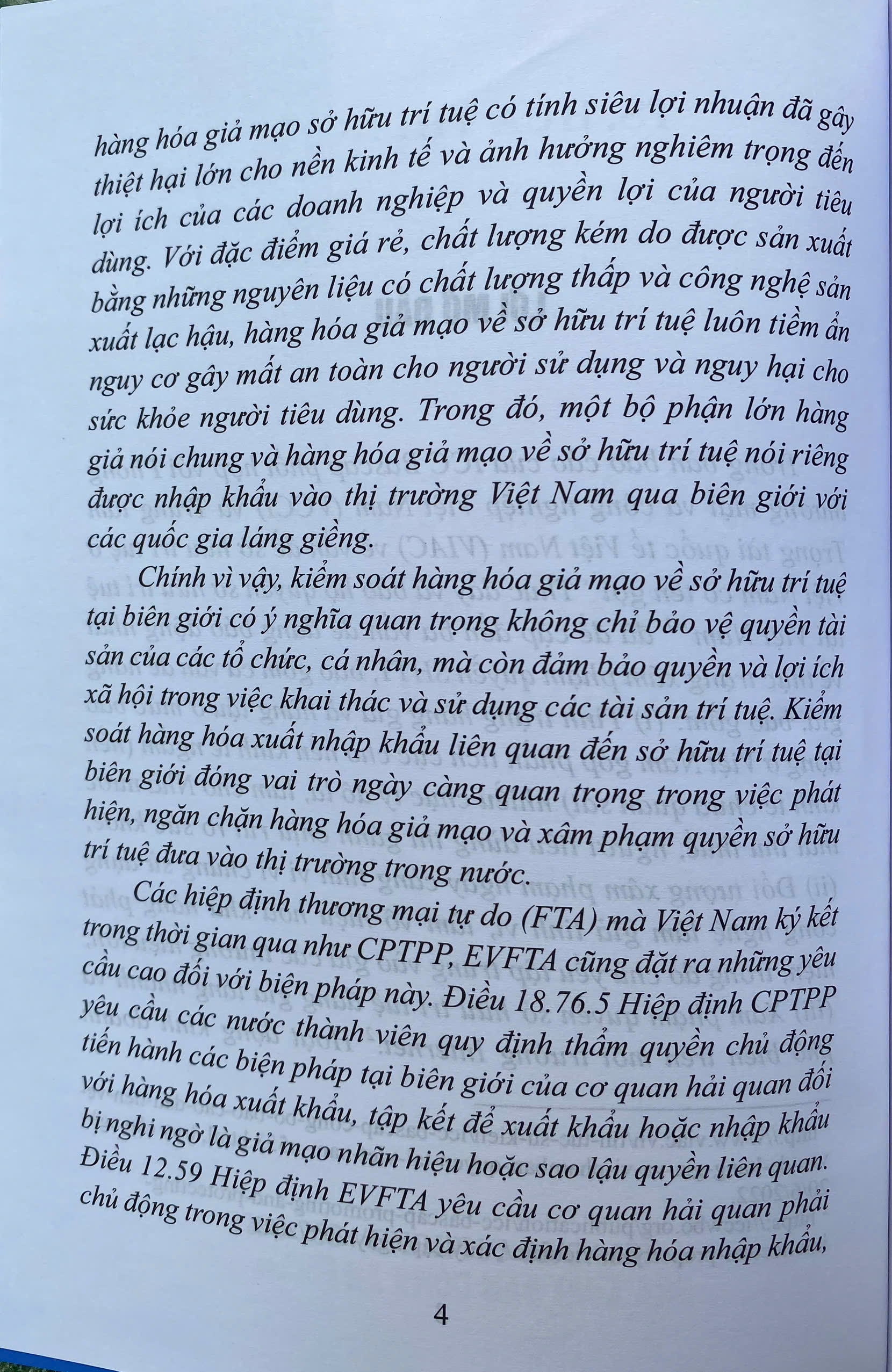 Các hiệp định thương mại tự do (F TA) mà Việt Nam ký kết trong thời gian qua như CPTPP, EVFTA cũng đặt ra những yêu cầu cao đối với biện pháp này. Điều 18.76.5 Hiệp định CPTPP yêu cầu các nước thành viên quy định thẩm quyền chủ động tiên hành các biện pháp tại biên giới của cơ quan hải quan đổi với hàng hóa xuất khẩu, tập kết để xuất khẩu hoặc nhập khẩu bị nghi ngờ là giả mạo nhãn hiệu hoặc sao lậu quyền liên quan. Điều 12.59 Hiệp định EVFTA yêu cầu cơ quan hải quan phải chủ động trong việc phát hiện và xác định hàng hóa nhập khẩu, xuất khẩu bị nghi ngờ x. âm phạm quyền sở hữu trí tuệ trên cơ sở các kỹ thuật phân tích rủi ro. Hiệp định này cũng yêu cầu cơ quan phải hợp tác với chủ thể quyền, bao gôm việc cho phép cung cấp thông tin để phân tích rủi ro.