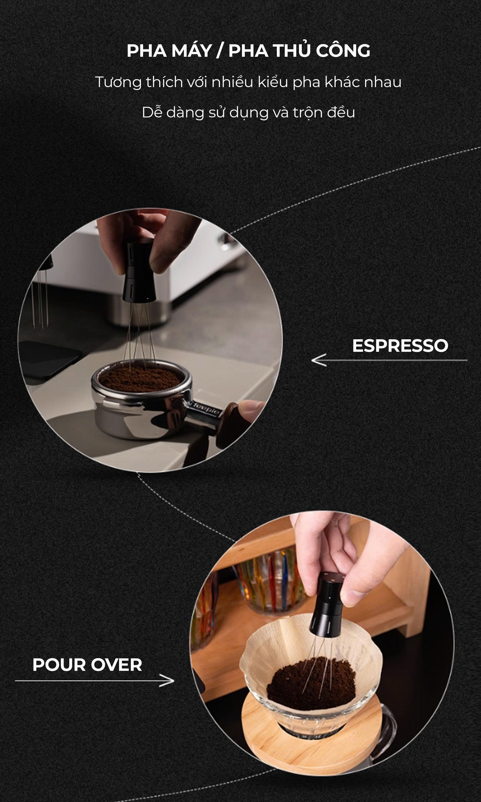 Sản phẩm được thiết kế dạng núm vặn bằng hợp kim nhôm sơn nhám. Cảm giác cầm rất chắc chắn và vừa tay. 8 thanh kim loại mỏng có độ dẻo và có thể uốn cong len lõi đánh tơi đến mọi nơi bên trong bánh cà phê. Khi bột được đánh tơi sẽ giúp phần tamping tốt hơn rất nhiều, áp suất nước sẽ chiết xuất đều hơn.