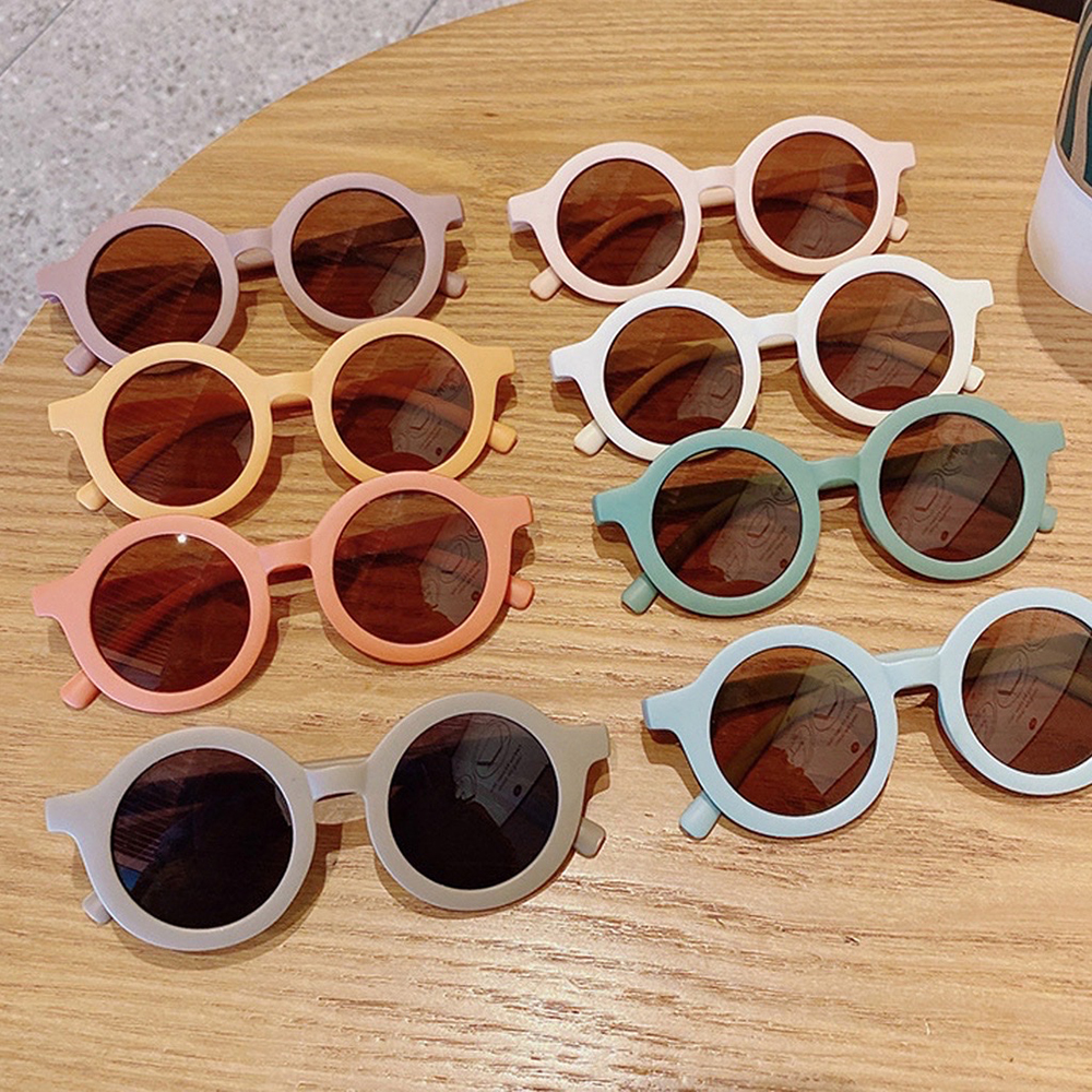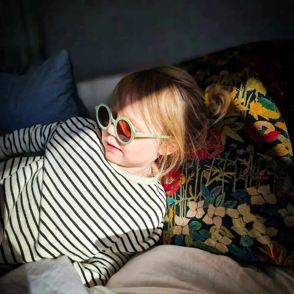 Ấn tượng: Kính chống tia cực tím với thiết kế hình tròn đáng yêu và màu xanh rêu nhẹ nhàng phù hợp với cả bé trai và bé gái.