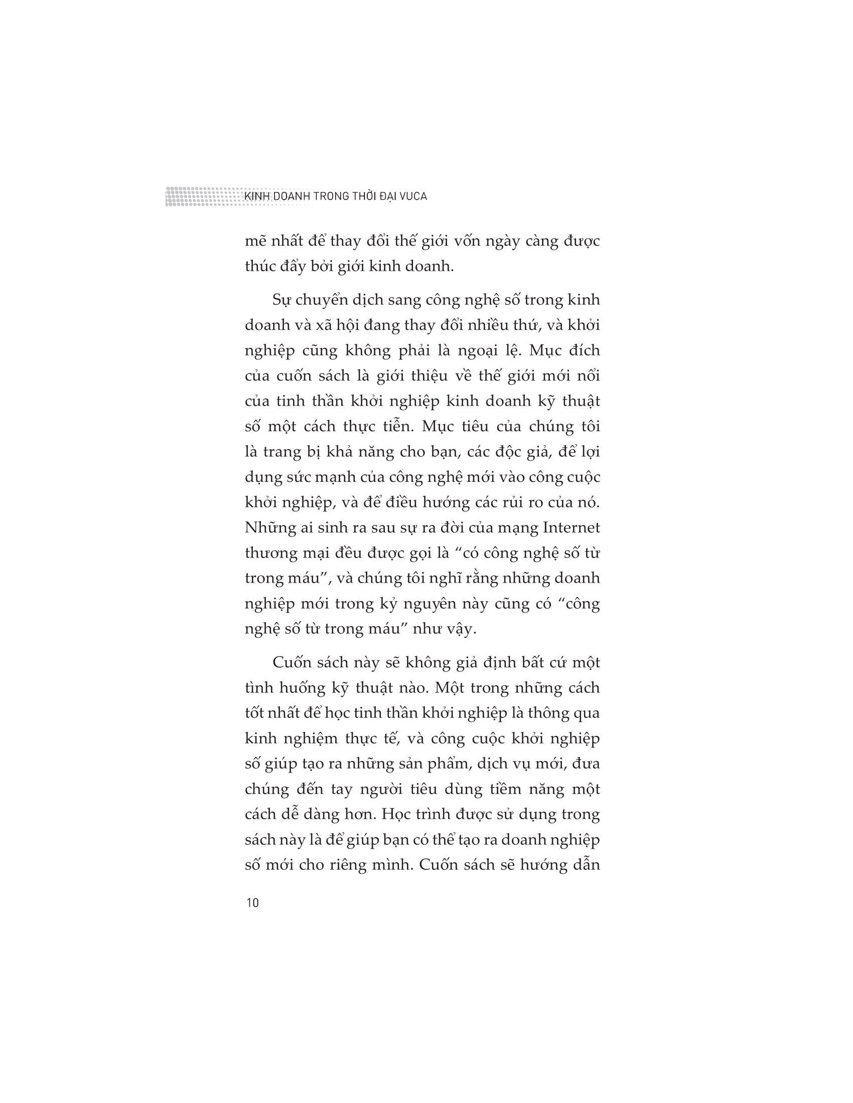 Kinh doanh trong thời đại VUCA – cuốn sách giới thiệu phiên bản giản lược của một quy trình tự làm chủ doanh nghiệp số: lên ý tưởng, xây dựng nguyên mẫu, thử nghiệm ý tưởng kinh doanh trên các khách hàng tiềm năng, và khai trương doanh nghiệp. Cuốn sách này sẽ chỉ cho bạn thấy: Bước đầu của việc tạo ra một doanh nghiệp số mới là nhận diện những cơ hội mới.