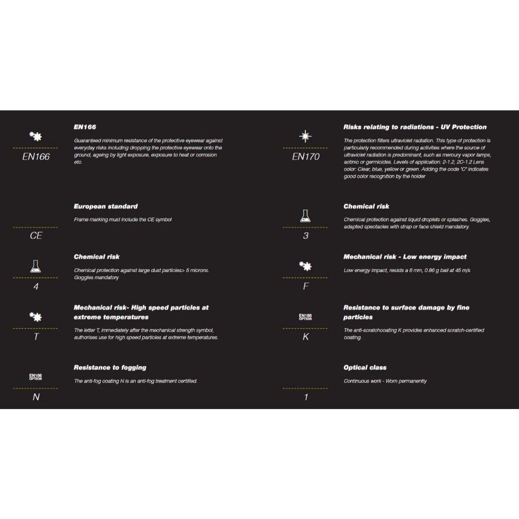 Chống tia UVA/ UVB 99,99% Chống văng bắn hóa chất Thích hợp dùng trong các phạm vi bên dưới: • Chemical splash protection • Cutting • Spraying • Dust protection • Acid and alkaline handling