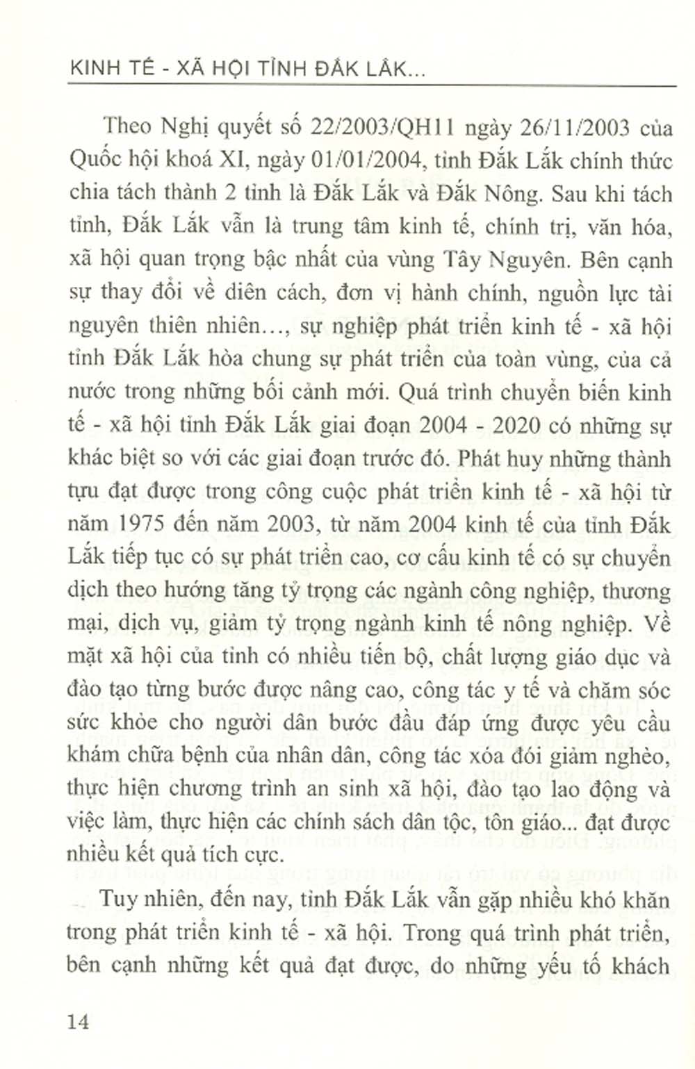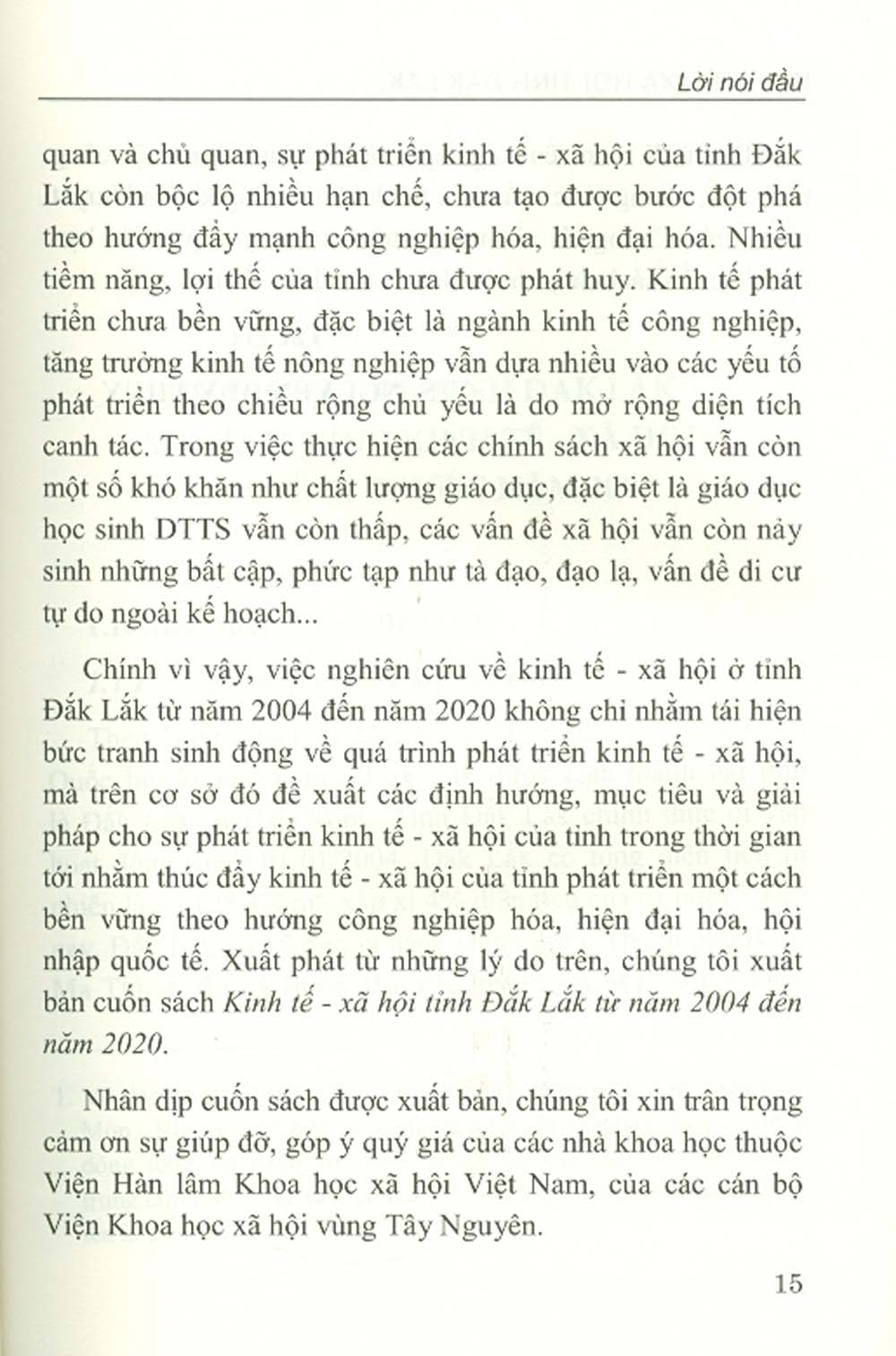 Tuy nhiên, đến nay, tỉnh Đắk Lắk vẫn gặp nhiều khó khăn trong phát triển kinh tế - xã hội. Trong quá trình phát triển, bên cạnh những kết quả đạt được, do những yếu tố khách quan và chủ quan, sự phát triển kinh tế - xã hội của tỉnh Đắk Lắk còn bộc lộ nhiều hạn chế, chưa tạo được bước đột phá theo hướng đẩy mạnh công nghiệp hóa, hiện đại hóa. Nhiều tiềm năng, lợi thế của tỉnh chưa được phát huy. Kinh tế phát triển chưa bền vững, đặc biệt là ngành kinh tế công nghiệp, tăng trưởng kinh tế nông nghiệp vẫn dựa nhiều vào các yếu tố phát triển theo chiều rộng chủ yếu là do mở rộng diện tích canh tác. Trong việc thực hiện các chính sách xã hội vẫn còn một số khó khăn như chất lượng giáo dục, đặc biệt là giáo dục học sinh DTTS vẫn còn thấp, các vấn đề xã hội vẫn còn nảy sinh những bất cập, phức tạp như tà đạo, đạo lạ, vấn đề di cư tự do ngoài kế hoạch. Chính vì vậy, việc nghiên cứu về kinh tế - xã hội ở tỉnh Đắk Lắk từ năm 2004 đến năm 2020 không chỉ nhằm tái hiện bức tranh sinh động về quá trình phát triển kinh tế - xã hội, mà trên cơ sở đó để xuất các định hướng, mục tiêu và giải pháp cho sự phát triển kinh tế - xã hội của tỉnh trong thời gian tới nhằm thúc đẩy kinh tế - xã hội của tỉnh phát triển một cách bền vững theo hướng công nghiệp hóa, hiện đại hóa, hội nhập quốc tế. Xuất phát từ những lý do trên, chúng tôi xuất bản cuốn sách Kinh tế - xã hội tỉnh Đắk Lắk từ năm 2004 đến năm 2020. .