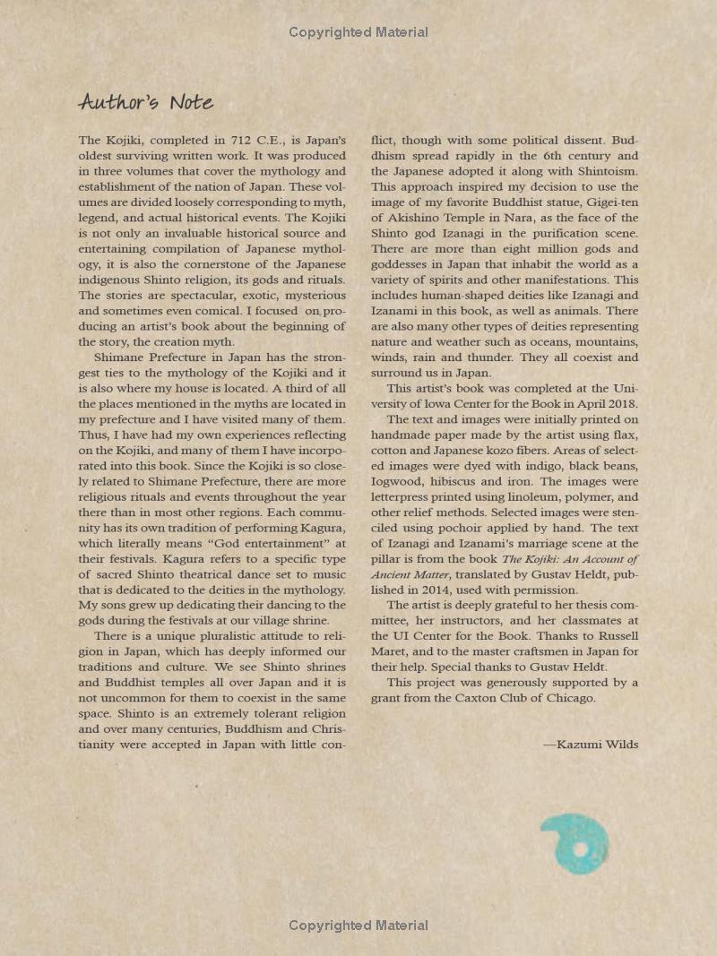 Kojiki: The Birth Of Japan: The Japanese Creation Myth Illustrated Take a step back in time to the origins of Japan's creation myth--told here for the very first time in illustrated form. In the beginning there was nothing--a void. Then the heavens and the earth took shape, as the ancient gods of Japan breathed the first sparks of life into these islands. The 1300 year-old Kojiki myth traces the beginnings of the Japanese people, following the rise of the Japanese islands from their humble origins as a lump of clay to a great nation that would one day take its rightful place among the leading nations of the world. Like all creation myths from around the world, the Kojiki story occupies a treasured place in the nation's literature and collective imagination. Kazumi Wilds's striking illustrations capture the drama and intensity of a mythic tale where chaos and demons are unleashed and where darkness is slowly pushed back by the righteous, as good prevails over evil. Kojiki: The Birth of Japan combines the raucous rhythms and startling imagery of today's best graphic novels with a retelling of a classic and timeless Japanese story. This book will be remembered and treasured for years to come by lovers of mythology, folklore and anyone interested in Japanese culture and history. For readers ages 14 & up