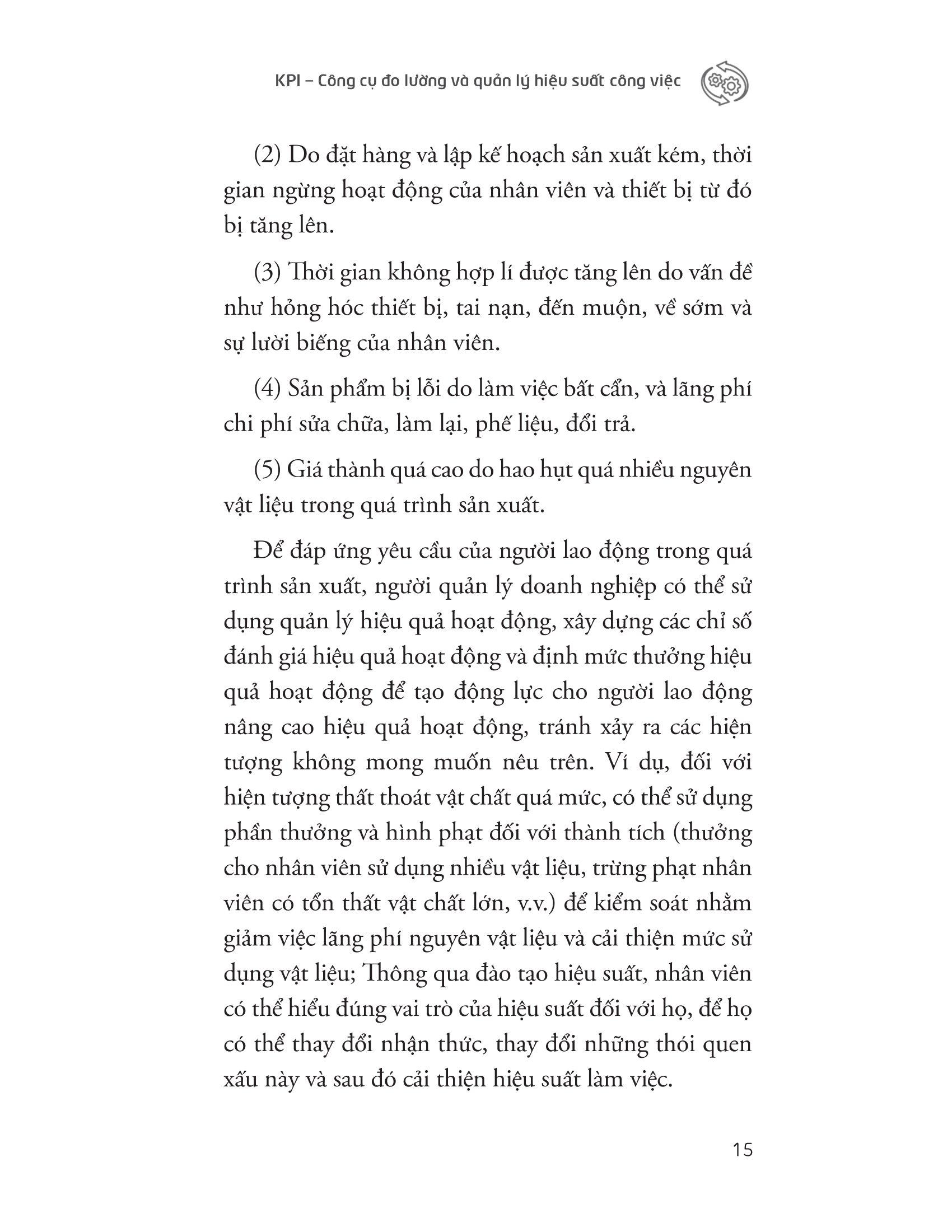 « KPI – Công cụ đo lường và quản lý hiệu suất công việc » khái quát thế nào là quản lý hiệu suất của sản xuất, thiết kế các chỉ số hoạt động sản xuất và lên kế hoạch thực hiện đối với nhân viên; kết nối, hướng dẫn trong hoạt động sản xuất; có những bài khảo hạch đánh giá hiệu suất sản xuất; có thái độ khen thưởng và phạt phù hợp đối với nhân viên trong hoạt động sản xuất và không ngừng cải tiến kỹ thuật. Đó chính là 7 khía cạnh giúp việc thực hiện quản lý hoạt động sản xuất mang lại hiệu quả toàn diện.
