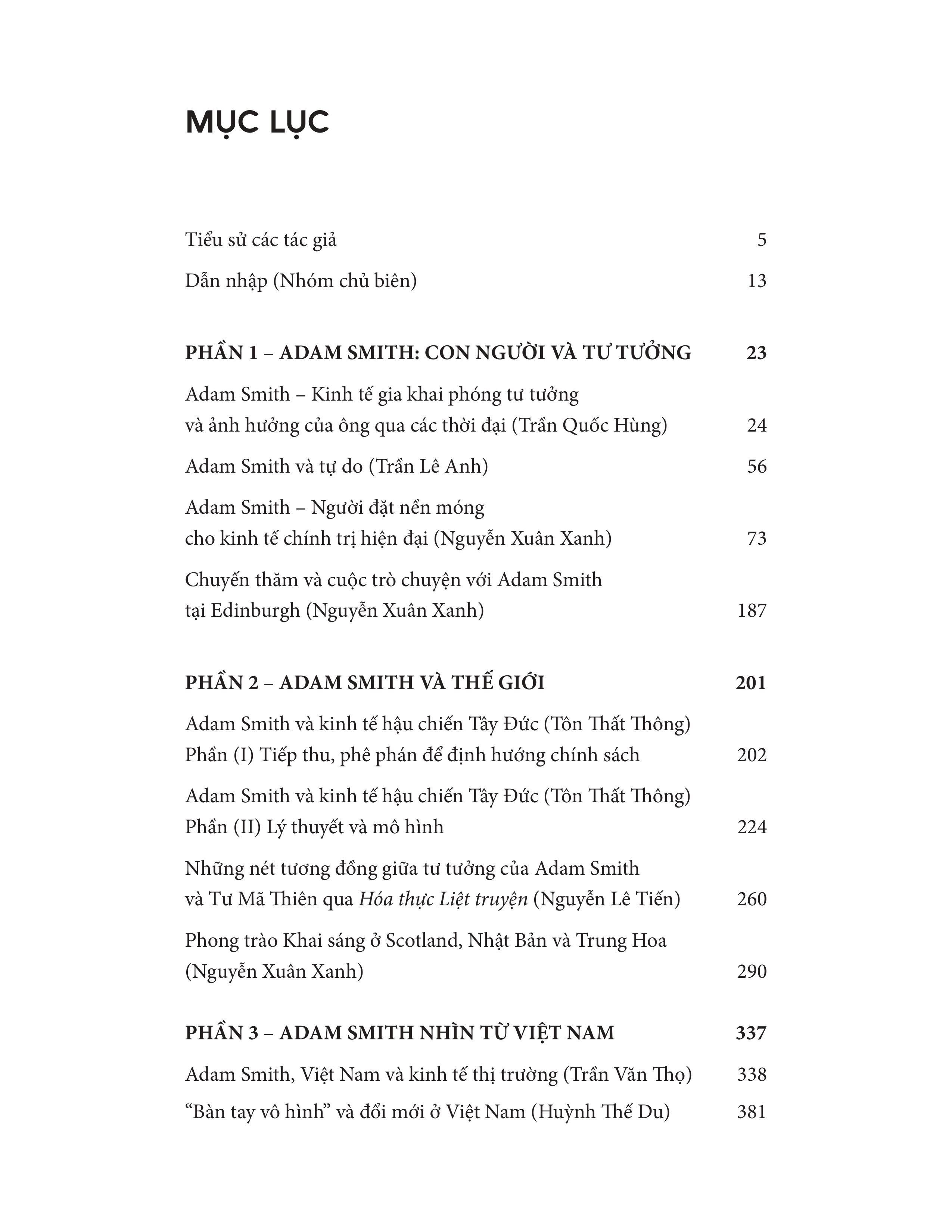 Cùng với đó là phần Phụ lục trích dịch 2 tác phẩm quan trọng nhất của ông - Sự phồn vinh của các quốc gia và Lý thuyết về tình cảm đạo đức. Trong gần 600 trang sách, các tác giả đã phác họa lại cuộc đời, bối cảnh lịch sử thời Adam Smith sinh sống, những yếu tố góp phần hun đúc nên tư tưởng quan trọng của ông; bên cạnh đó, các tác giả đã phóng chiếu, bàn sâu về sự ảnh hưởng của ông lên lý thuyết kinh tế thế giới, cho thấy tư tưởng vượt thời cùng những cấp tiến bên trong bộ óc lỗi lạc.
