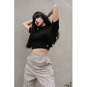BORIP COTTON 100% 4 CHIỀU, CHẤT DÀY MỀM, THOÁNG MÁT ÁO MÀU ĐEN, CỔ POLO DÂY KÉO SẮT YKK FORM ÔM, TAY NGẮN, CROPTOP ĐIỂM NHẤN TAG LOGO LAAS TRÊN LAI ÁO